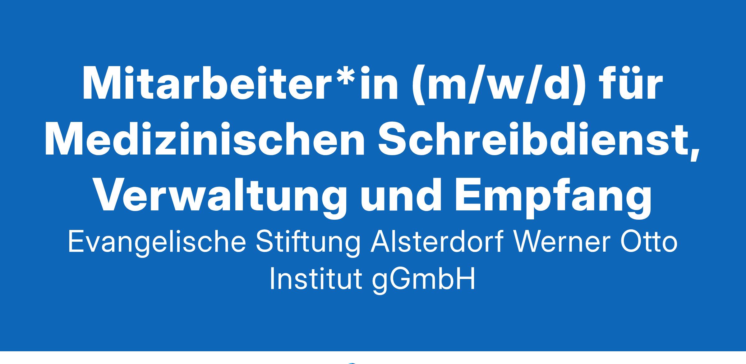 Willkommen in der Evangelischen Stiftung Alsterdorf. Als diakonisches Dienstleistungsunternehmen in Norddeutschland mit rund 6.500 Mitarbeitenden sind wir schwerpunktmäßig in den Bereichen Eingliederungshilfe, Bildung und Medizin tätig. Wir suchen engagierte Unterstützung für unsere Verwaltung als Mitarbeiter *in (m/w/d) für Medizinischen Schreibdienst, Verwaltung und Empfang Arbeitsumfeld Die Werner Otto Institut gGmbH (WOI) betreut als eines der großen Sozialpädiatrischen Zentren Kinder und Jugendliche (0 – 18 Jahre) mit Entwicklungsstörungen sowie drohenden oder manifesten Behinderungen und bietet ein breites diagnostisches Spektrum sowie vielfältige Therapien an. Wir pflegen eine enge Zusammenarbeit mit Therapeut*innen, Frühförderstellen, Kindertagesstätten, Schulen, niedergelassenen Kinder- / Jugendärzten/Jugendärztinnen und -psychiater*innen sowie Kliniken. Wir bieten Ihnen