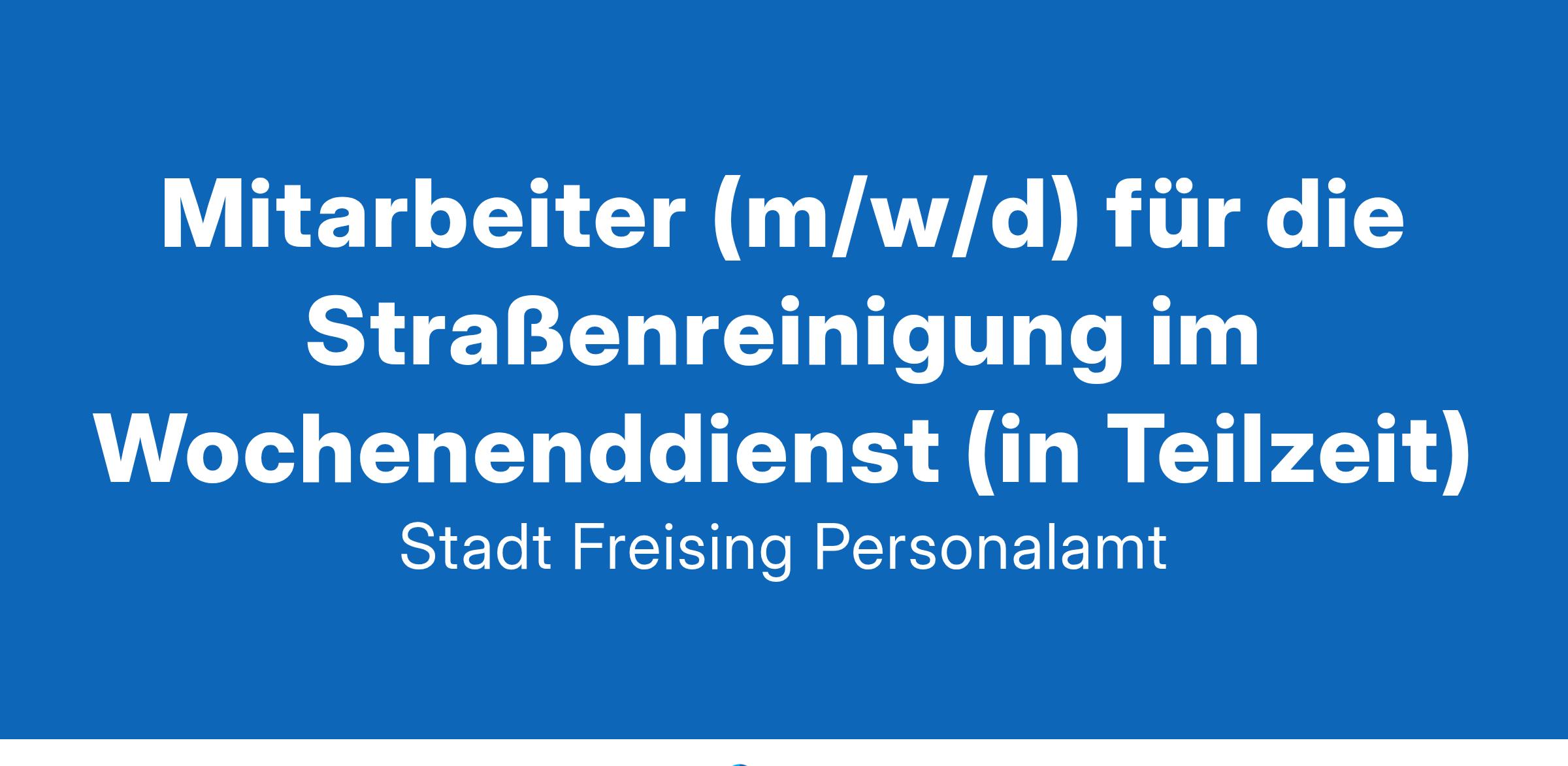 Wir. Für Freising. Werden Sie Teil unseres Teams und kommen Sie zu uns als Mitarbeiter (m/w/d) für die Straßenreinigung im Wochenenddienst Das zahlen wir: bis Entgeltgruppe 4 TVöD Arbeitszeitregelung: in Teilzeit mit 19,5 Wochenstunden, befristet auf vorerst zwei Jahre Bewerbungsfrist: bis spätestens 23.02.2025 Start: zum nächstmöglichen Zeitpunkt Das sind Ihre Aufgaben: Überwiegend Straßenreinigungsarbeiten in Parkanlagen und im städtischen Straßen- und Wegenetz am Wochenende Übernahme von vielfältigen Arbeiten im Bauhof Unterstützung im Winterdienst Zwingende Anforderung: Berufserfahrung in einem Handwerksberuf Führerschein der Klasse B Damit können Sie punkten: Teamfähigkeit, Zuverlässigkeit und Engagement Selbstständige Arbeitsweise und Verantwortungsbewusstsein Organisationstalent, zielorientiertes Handeln Führerschein der Klasse BE / CE Damit punkten wir: Krisensicherer und modern ausgerichteter Arbeitsplatz mit flexiblen, aber geregelten Arbeitszeiten Faire Lohngestaltung und zusätzliche leistungsabhängige Vergütung Freising-Zulage in Höhe von 270 Euro (brutto, Vollzeitbeschäftigung); für jedes Kind gibt es bei vorliegendem Kindergeldbezug monatlich 50 Euro (brutto, Vollzeitbeschäftigung) extra Betriebliche Altersvorsorge: Selbstverständlich – und das ohne Einzahlung durch Sie! Nähere Informationen erhalten Sie hier Übernahme der Fahrtkosten bei Nutzung des ÖPNV Urlaubsanspruch von 30 Tagen bei einer Fünftagewoche Kostengünstige Dienstwohnung (je nach Verfügbarkeit) Eine Vielzahl an Fortbildungsangeboten, die darauf warten, von Ihnen entdeckt zu werden Interesse? Fragen? Bitte bewerben Sie sich bevorzugt online über unser Karriereportal. Bei Fragen zur Stelle antwortet Ihnen gerne Herr Markus Tafelmaier (Bauhofleitung), Tel. 08161 54-47300. Bei Fragen zum Bewerbungsmanagement steht Ihnen gerne Frau Isabella Sieber, Tel. 08161 54-41150, zur Verfügung. Wir freuen uns auf Ihre Bewerbung!
