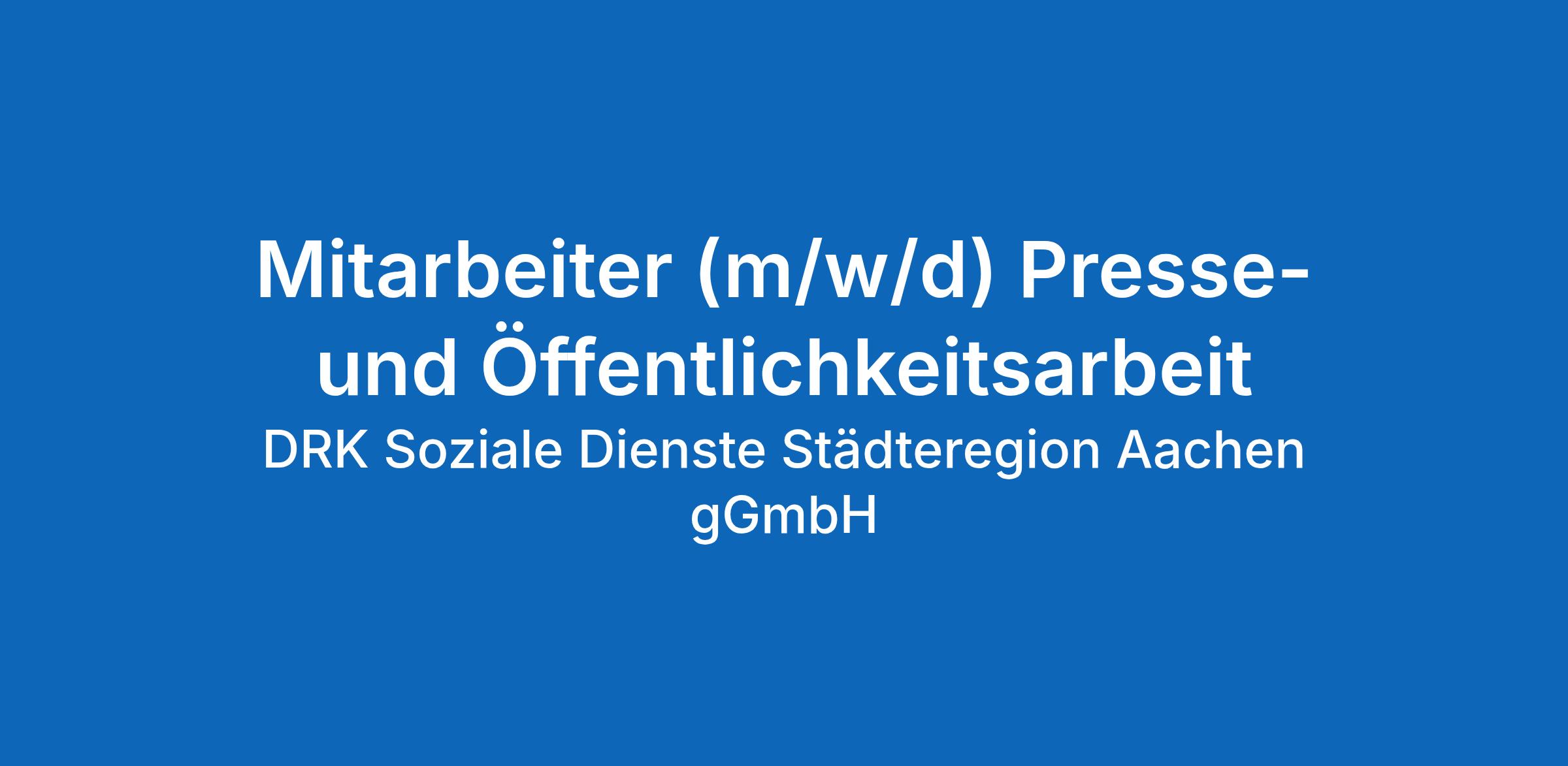 Wir, das DRK in der StädteRegion Aachen suchen schnellstmöglich einen Mitarbeiter (m/w/d) für die Presse- und Öffentlichkeitsarbeit in Vollzeit. Die Anstellung erfolgt zunächst befristet auf ein Jahr mit Option auf Übernahme in ein unbefristetes Arbeitsverhältnis.