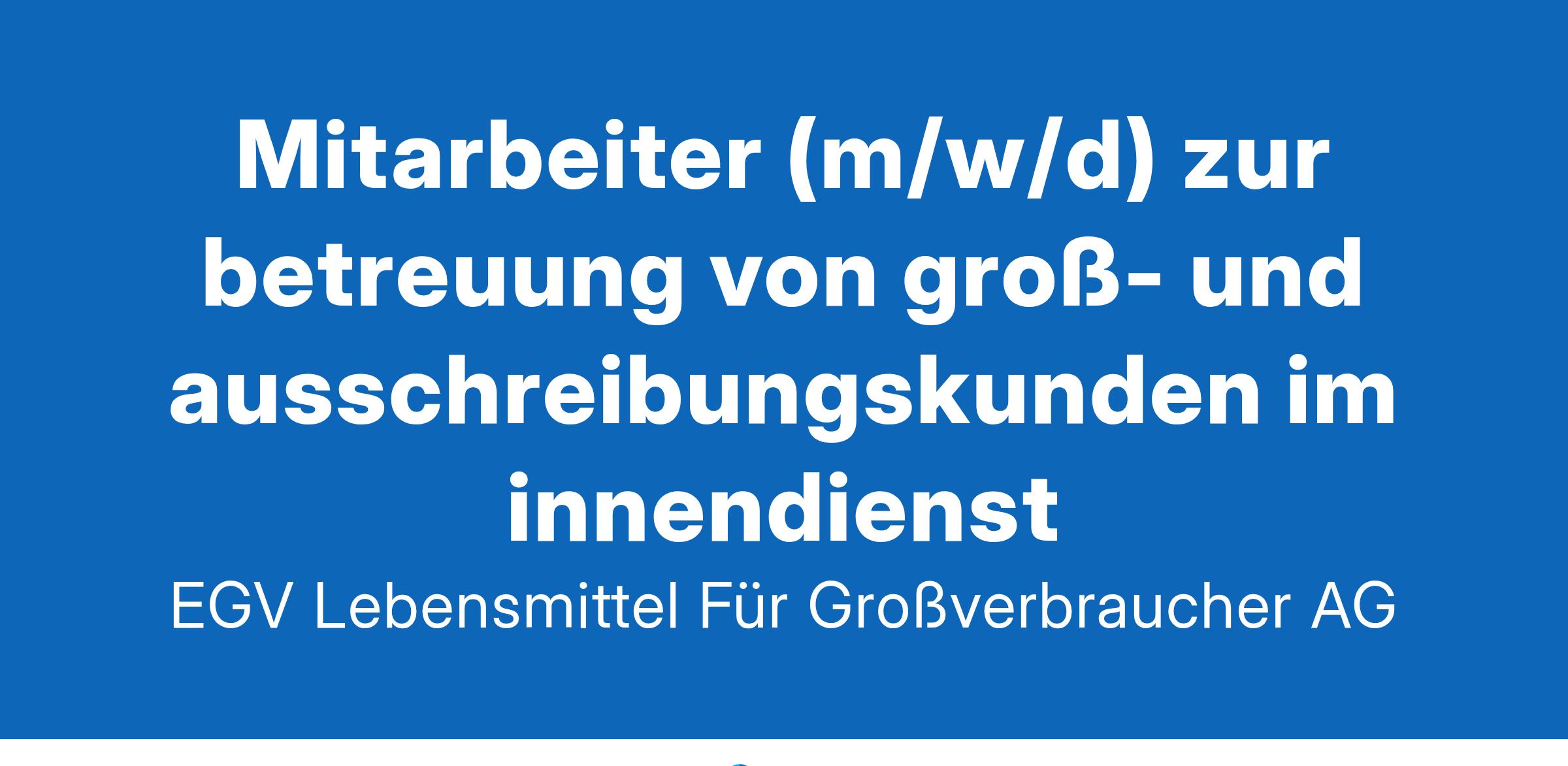 & Uuml;ber unsKOMM INS TEAM!Die mittelständisch geprägte EGV|AG beliefert Profi-Kunden aus der Gemeinschaftsverpflegung, im Gesundheits- und Sozialbereich, Bildung, Betriebsgastronomie sowie Hotellerie regional und überregional zuverlässig und schnell als Lebensmittel-Vollsortimenter mit hoher Frischekompetenz. Auf Augenhöhe handelt die EGV|AG freundlich, kompetent und persönlich und entwickelt unkompliziert Lösungen mit ihren Kunden.Die EGV|AG zählt heute mit sieben Standorten zu den führenden Lebensmittelgroßhändlern Deutschlands.Wir suchen zur Verstärkung unseres Vertriebsteams für unseren Standort in Unna ab sofort in VollzeitMitarbeiter (m/w/d) zur Betreuung von Groß- und Ausschreibungskunden im InnendienstIhre AufgabenBetreuung von Groß- und Ausschreibungskunden gemeinsam mit dem Key-Account-Manager im InnendienstEigenständige Bearbeitung von Ausschreibungen und Erstellung komplexer Angebote, einschließlich der Erstellung kundenspezifischer Preis- und Sortimentslisten sowie StatistikenKoordination und Kommunikation mit den Zentralen unserer Kunden und allen internen FachbereichenOptimierung der Prozesse und Sicherstellung einer reibungslosen ZusammenarbeitAnalyse und Bearbeitung kundenindividueller Preis- und Artikeldaten zur Gewährleistung der korrekten Preisgestaltung und ArtikelverwaltungIhr ProfilSie besitzen eine abgeschlossene kaufmännische Ausbildung (idealerweise im Groß- und Außenhandel oder in der Industrie) oder ein Studium der Betriebswirtschaftslehre / OecotrophologieSie können eine mehrjährige Berufserfahrung, vorzugsweise im Lebensmittelgroßhandel, vorweisenBranchenkenntnisse im Bereich Food-Service und im Außer-Haus-Markt/Lebensmittelgroßverbraucher sind von VorteilSie sind sicher im Umgang mit MS Office, insbesondere im Umgang mit ExcelSie verfügen über eine sehr gute Kommunikations- und Teamfähigkeit sowie eine ausgeprägte Kunden- und ServiceorientierungStarkes analytisches Denken und ein ausgeprägtes Zahlenverständnis unterstreichen Ihre PersonSie arbeiten selbstständig, strukturiert und ergebnisorientiertWir bietenEinen sicheren Arbeitsplatz in einem führenden und modernen GroßhandelsunternehmenEine langfristige Perspektive und EntwicklungsmöglichkeitenUmfassende Einarbeitung und kontinuierliche Unterstützung durch erfahrene KollegenFlache Hierarchien und eine Kultur der offenen TürenFlexible Arbeitszeitmodelle mit Möglichkeit des mobilen ArbeitensWeihnachts- und Urlaubsgeld30 Tage UrlaubFrisches Obst, Kaffee und WasserRegelmäßige TeameventsJob Rad Leasing AngeboteKontaktinformationenWir freuen uns darauf, Ihre Bewerbung mit Angabe des frühestmöglichen Eintrittstermins und Ihrer Gehaltsvorstellung zu erhalten.Nutzen Sie dafür gerne unsere einfache Onlinebewerbung über den „ Jetzt Bewerben“ Button.EGV Lebensmittel für Großverbraucher AGChristian SchlitzerWerler Str. 4259423 UnnaInformationen zur Datenverarbeitung