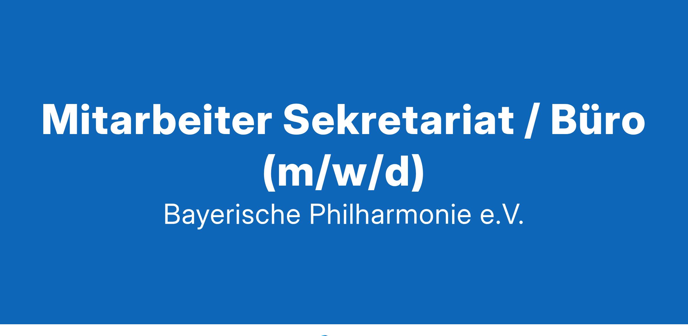Komm in unser Team! Die Bayerische Philharmonie - MEHR ALS DU DENKST, ANDERS ALS DU GLAUBST Music. Passion. Community. Seit 1994 ist der gemeinnützige Verein Bayerische Philharmonie als multinationale und generationenübergreifende Institution konzipiert und engagiert. Sein Zweck ist die Förderung von Musikern mit dem Ziel symphonisches Musizieren zu vermitteln und professionell zu musizieren. Für die Bayerische Philharmonie ist es in Verbindung mit ihrem künstlerischen und pädagogischen Programm seit jeher von besonderer Bedeutung, sich ebenbürtig dazu dem sozialen Engagement zu widmen und dadurch eine Kultur der gesellschaftlichen Mitverantwortung zu pflegen. Wir suchen zum nächstmöglichen Zeitpunkt einen Mitarbeiter Sekretariat/ Büro (m,w,d) Aufgaben: administrative Unterstützung der Geschäftsleitung Terminkoordination und -organisation Korrespondenz (Telefon, E-Mail, Post) Mitgliederverwaltung allgemeine Organisationstätigkeiten im Büro allgemeine Projektmitarbeit bei Veranstaltungen Kenntnisse: kaufmännische Ausbildung und idealerweise mehrjährige Berufserfahrung im administrativen Bereich strukturiertes und eigenverantwortliches Arbeiten freundliches und sicheres Auftreten Teamfähigkeit sicherer Umgang mit MS Office (v.a. Word, Excel, PowerPoint, Outlook, Teams) sehr gute Sprachkenntnisse in Deutsch in Wort und Schrift Benefits: Mitarbeit in einem dynamischen und leidenschaftlichen Team gemeinnützige und sinnstiftende Tätigkeit Teil der BayPhil-Family mit flacher Hierarchie vielseitiger Arbeitsbereich mit Wertschätzung Datenbank mit Salesforce beste Verkehrsanbindung nach München-Pasing Interesse? Dann schicke uns Deine Bewerbung direkt an intendanzbuero[AT]bayerische-philharmonie.de Bayerische Philharmonie, Bäckerstraße 46, 81241 München