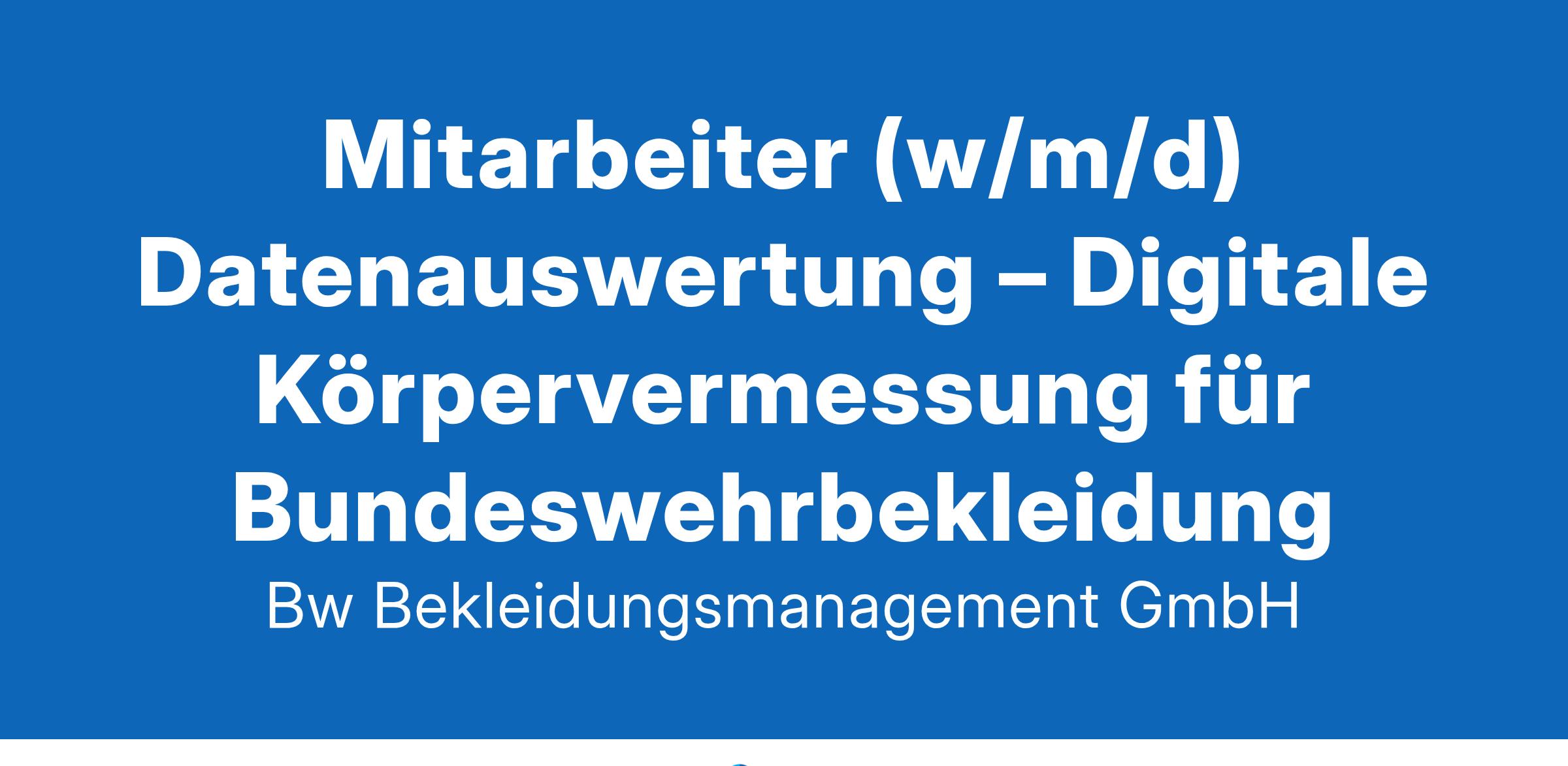 Die Bekleidung der Bundeswehr ist unser Job. Von der Spezifikation über die Ausschreibung, Vergabe, Qualitätssicherung bis hin zur Logistik, zum Vertrieb und der Aufbereitung verantwortet die Bw Bekleidungsmanagement GmbH (BwBM) die gesamte Wertschöpfungskette der Bundeswehr-Bekleidung – von den Schuhen bis zum Helm. Damit kleiden wir rund 250.000 aktive Soldatinnen/Soldaten sowie Reservistinnen/Reservisten und zivile Mitarbeiterinnen/Mitarbeiter der Bundeswehr ein. So umfassend wie unsere Aufgabe, so vielseitig sind die beruflichen Möglichkeiten, die wir unseren ca. 1.700 Mitarbeiterinnen und Mitarbeitern in unserer Zentrale in Köln oder an einem unserer rund 110 Standorte in ganz Deutschland bieten können. Wir bieten sichere Arbeitsplätze und wachsen stetig weiter. Wir suchen Sie –befristet bis zum 30.11.2026 – in Teilzeit (20 Std./Woche) für das Karrierecenter der Bundeswehr in der Gereon-Kaserne Köln als: Mitarbeiter (w/m/d) Datenauswertung Digitale Körpervermessung für Bundeswehrbekleidung Im Rahmen der Gestaltung moderner Serviceprozesse findet als Pilotprojekt im Karrierecenter der Bundeswehr die digitale Körpervermessung für Uniformen und Bekleidung mithilfe eines Bodyscanners statt. Darüber hinaus werden Sie bei kaufmännischen Tätigkeiten unterstützen und dabei intensive Einblicke in unsere Prozesse erhalten. IHRE AUFGABEN: