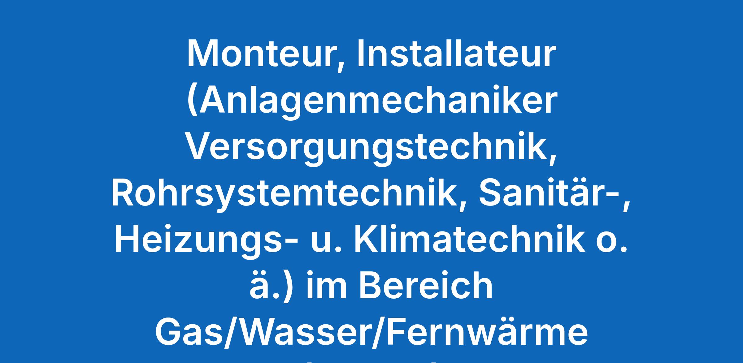 Monteur, Installateur (Anlagenmechaniker Versorgungstechnik, Rohrsystemtechnik, Sanitär-, Heizungs- u. Klimatechnik o. ä.) im Bereich Gas/Wasser/Fernwärme (m/w/d)
