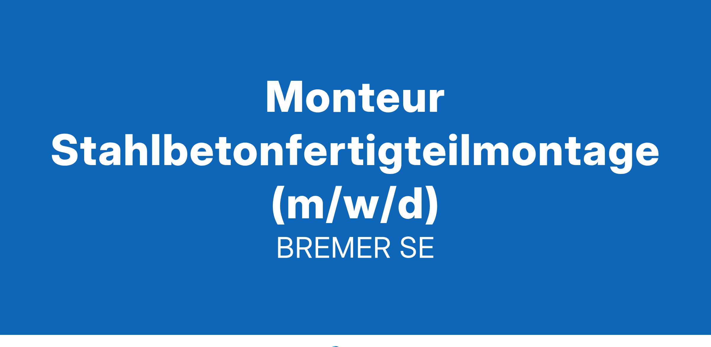 MONTEUR STAHLBETONFERTIGTEILMONTAGE (m/w/d)BerufserfahrungHandwerkProduktion, FertigungWIR SIND:In Deutschland zählt BREMER zu den führenden Unternehmen im schlüsselfertigen Industrie- und Gewerbebau. Als ganzheitlicher Anbieter der Immobilien- und Bauwirtschaft begleiten wir unsere Kunden von der Projektentwicklung über die Fertigung in eigenen Werken bis zum schlüsselfertigen Bau und den Serviceleistungen für das Gebäude im laufenden Betrieb. Das 1947 gegründete Familienunternehmen agiert an fünfzehn deutschen und zwei polnischen Standorten und erwirtschaftet aktuell eine Betriebsleistung von gut 1.100 Mio. EUR. Rund 1300 Mitarbeitende setzen sich täglich mit Leidenschaft für den Kundenerfolg ein.
