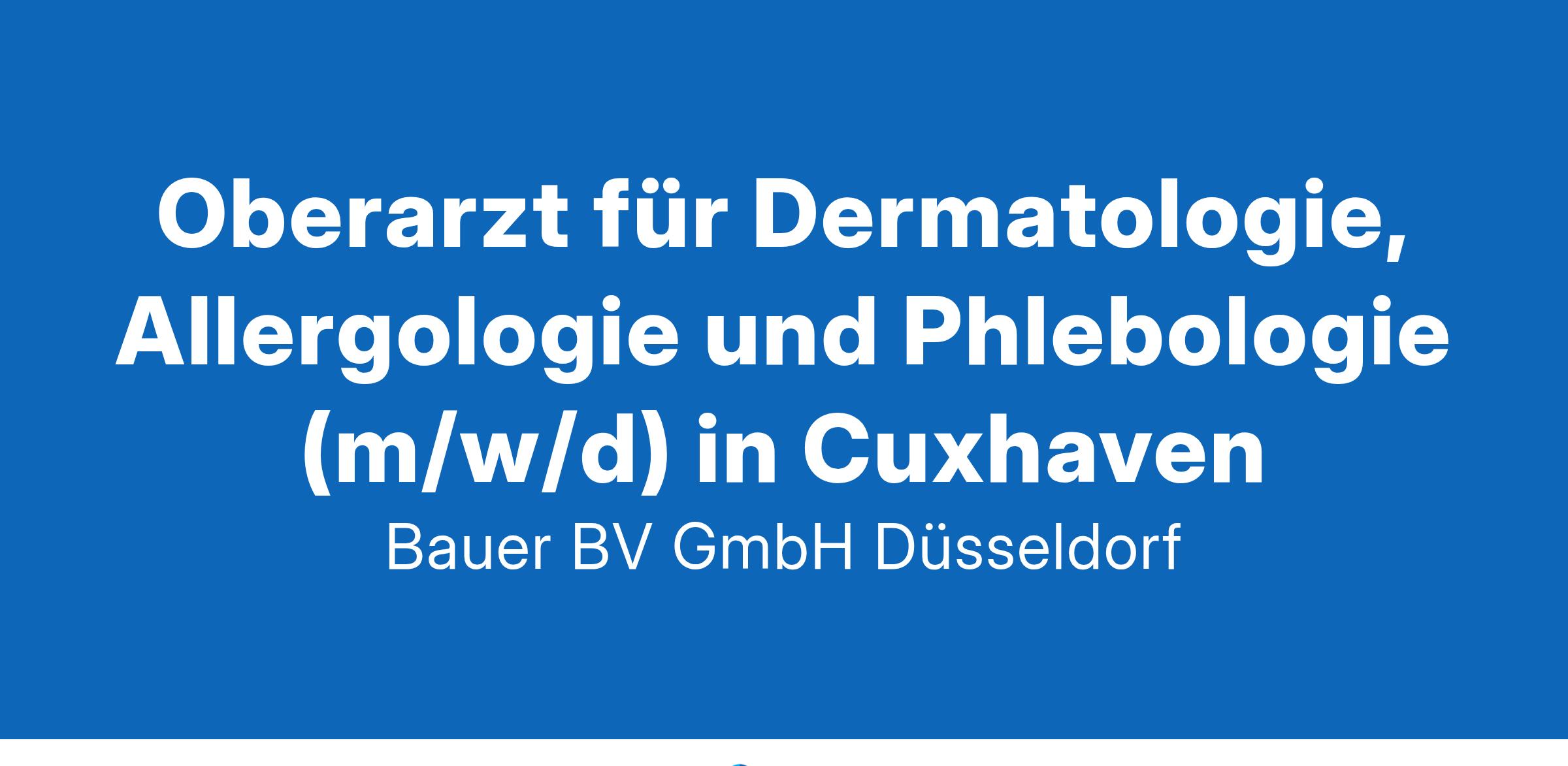 Anstellungsart(en): VollzeitIhr neuer Arbeitsplatz:Akademisches Lehrkrankenhaus der Maximalversorgung mit 850 Betten in der Region Cuxhaven. Die Hautklinik hat einen überregionalen Einzugsbereich und verfügt über eine stationäre Abteilung, eine Tagesklinik, zertifizierte Hautkrebs- und Wundzentren nebst Ambulanz. Schwerpunkte der Abteilung sind die Allergologie, die dermatologische Onkologie, die Phlebologie und die Dermatochirurgie. Eine ambulante spezialfachärztliche Versorgung ist angegliedert.Ihre Vorteile:Attraktiver und verantwortungsvoller ArbeitsplatzPersönliche und fachliche WeiterentwicklungFreundliches und engagiertes TeamAttraktive VergütungUnterstützung und Förderung von WeiterbildungenUnbefristete FestanstellungIhr Profil:Facharzt für Haut- und Geschlechtskrankheiten / Dermatologie (m/w/d)Zusatzbezeichnung Allergologie oder Phlebologie wünschenswertFundierte Kenntnisse im FachbereichEngagement und TeamfähigkeitIhr Ansprechpartner:Bauer B+V Personalberatung