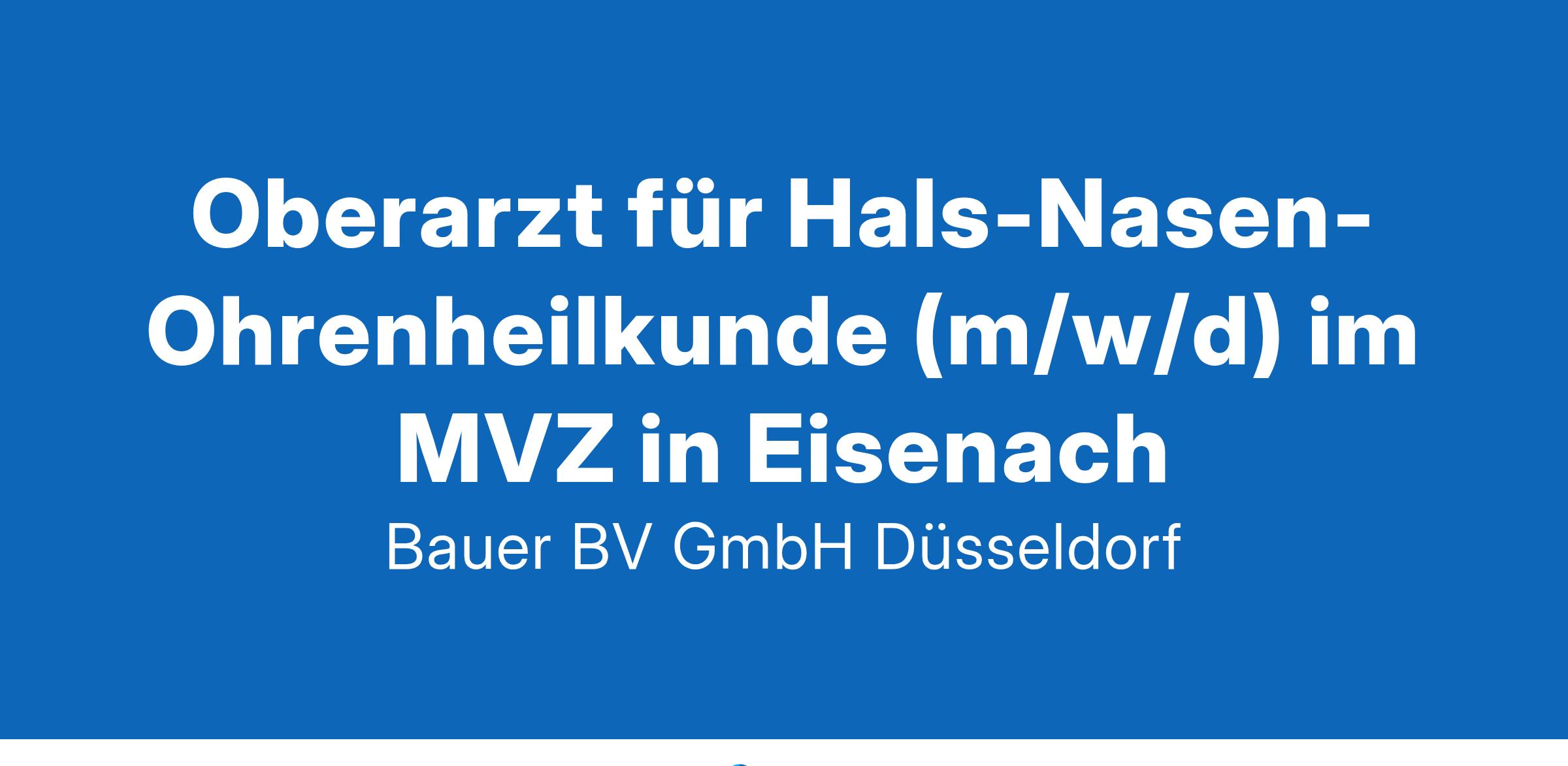 Anstellungsart(en): VollzeitIhr neuer Arbeitsplatz:Medizinisches Versorgungszentrum im Raum Eisenach. Das MVZ für Hals-Nasen-Ohrenheilkunde betreut das gesamte ambulante Spektrum des Fachgebietes.Ihre Vorteile:Modernes MVZ in attraktiver LageAbwechslungsreiche und verantwortungsvolle TätigkeitGroßer GestaltungsspielraumFreundliches und engagiertes TeamViele WeiterbildungsmöglichkeitenAttraktive VergütungUnbefristete FestanstellungIhr Profil:Facharzt (m/w/d) für Hals-Nasen-OhrenheilkundeFachliche ExpertiseEngagement und TeamfähigkeitIhr Ansprechpartner:Bauer B+V Personalberatung