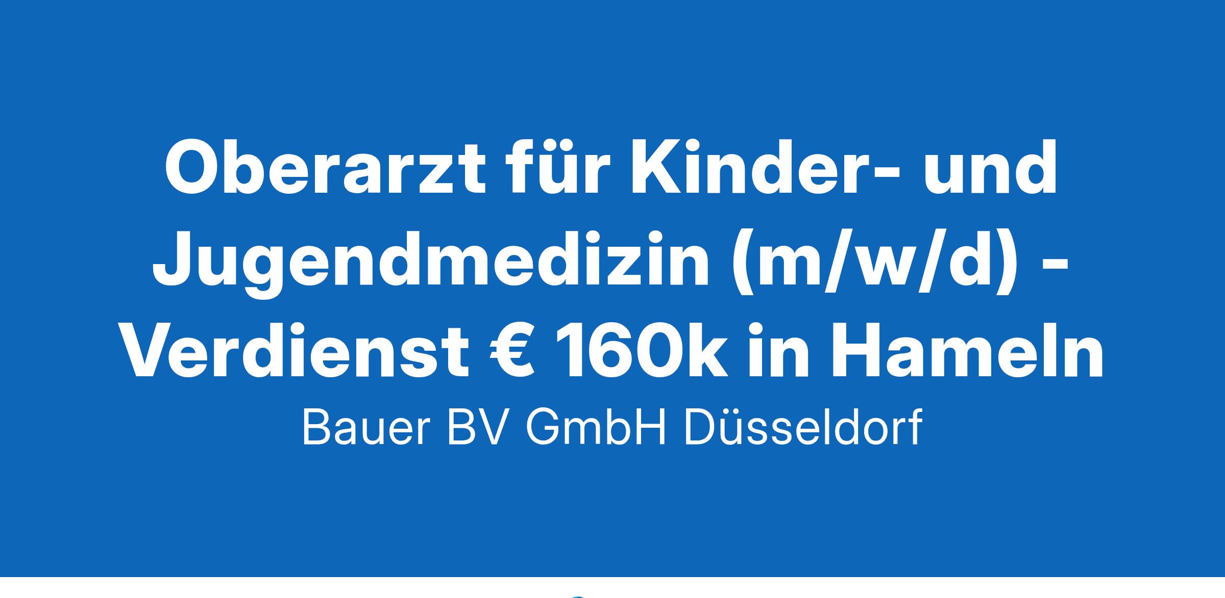 Anstellungsart(en): Teilzeit - flexibel, VollzeitIhr neuer Arbeitsplatz:Das akademische Lehrkrankenhaus mit 450 Betten in der Region Hameln gehört zu einem Verbund von vier Krankenhäusern, fünf Senioreneinrichtungen und fünf ambulanten Pflegestationen mit insgesamt 900 Betten und 3.000 Mitarbeitern.Die Klinik für Kinder- und Jugendmedizin betreut ein breites fachliches Spektrum inkl. Kinderintensivstation mit einer Spezialisierung auf die Bereiche Asthma, Allergien, Adipositas und Diabetes. Angegliedert ist ein Medizinisches Versorgungszentrum (MVZ) für ambulante Behandlungen.Ihre Vorteile:Attraktiver und vielseitiger ArbeitsplatzMultiprofessionelles und -kulturelles TeamFamiliäres und kollegiales ArbeitsklimaGelebte Wertschätzung von Team und VerwaltungÜbertarifliche VergütungUnbefristete Festanstellung in Voll- oder TeilzeitIhr Profil:Facharzt für Kinder- und Jugendmedizin (m/w/d)Fundierte Kenntnisse im FachbereichBegeisterung, Kinder und Jugendliche zu versorgenIhr Ansprechpartner:Bauer B+V Personalberatung