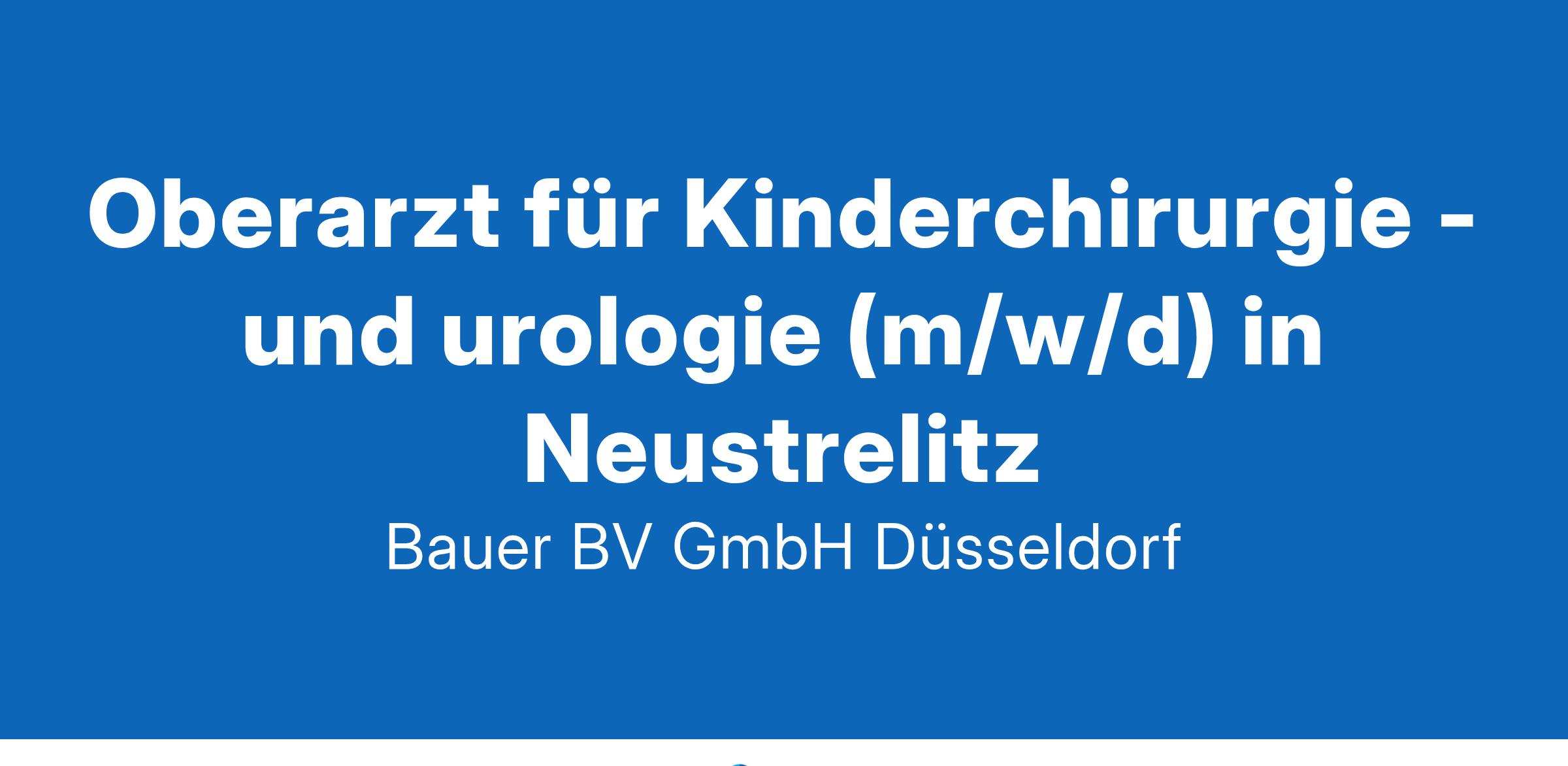 Anstellungsart(en): VollzeitIhr neuer Arbeitsplatz:Akademisches Lehrkrankenhaus mit Rund 900 Betten in Raum Neustrelitz. Die Abteilung für Kinderchirurgie und Kinderurologie ist eine der größten kinderchirurgische Einrichtung im Umkreis und ausgezeichnet mit dem Gütesiegel „Ausgezeichnet. FÜR KINDER“. Sie ist integraler Bestandteil des Perinatalzentrums Level 1.Ihre Vorteile:Moderne Klinik mit breitem fachlichen SpektrumFrüh- und NeugeborenenchirurgieKinderurologie und KinderunfallchirurgieZulassung zur Behandlung schwerer Kita- und SchulunfälleThermischer Verletzungen bis zu 30 % KörperoberflächeFreundliches und engagiertes TeamUnterstützung von Fort- und WeiterbildungenGeregelte ArbeitszeitenAttraktive VergütungUnbefristete Festanstellung mit PerspektiveIhr Profil:Facharzt (m/w/d) für Kinder- und JugendmedizinGerne Zusatzbezeichnung Kinderchirurgie und KinderurologieFundierte Kenntnisse im FachbereichEngagement, Teamfähigkeit und EinfühlsamIhr Ansprechpartner:Bauer B+V Personalberatung
