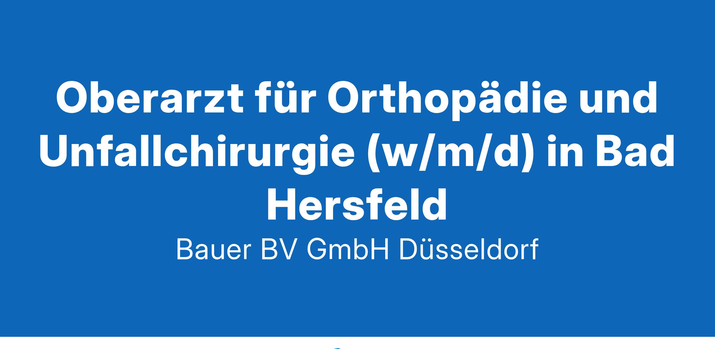 Anstellungsart(en): VollzeitIhr neuer Arbeitsplatz:Ambulante Rehaeinrichtung mit Standorten in ganz Deutschland. Für den Standort in der Region Bad Hersfeld wird ein erfahrener Oberarzt für Orthopädie und Unfallchirurgie (m/w/d) gesucht.Ihre Vorteile:Verantwortungsvolle AufgabeDurchführung von Aufnahme-, Zwischen- und EntlassungsuntersuchungenEigenverantwortliche Behandlung der Rehabilitandinnen und RehabilitandenZusammenarbeit mit den Kolleg*innen im interdisziplinären TeamFlexible ArbeitsmodelleWeiterentwicklung durch FortbildungstageAttraktive Vergütung inkl. betrieblicher AltersvorsorgeUnbefristete FestanstellungIhr Profil:Facharzt für Orthopädie und Unfallchirurgie (m/w/d)Gerne Erfahrungen im RehabilitationswesenEngagement und TeamfähigkeitIhr Ansprechpartner:Bauer B+V Personalberatung