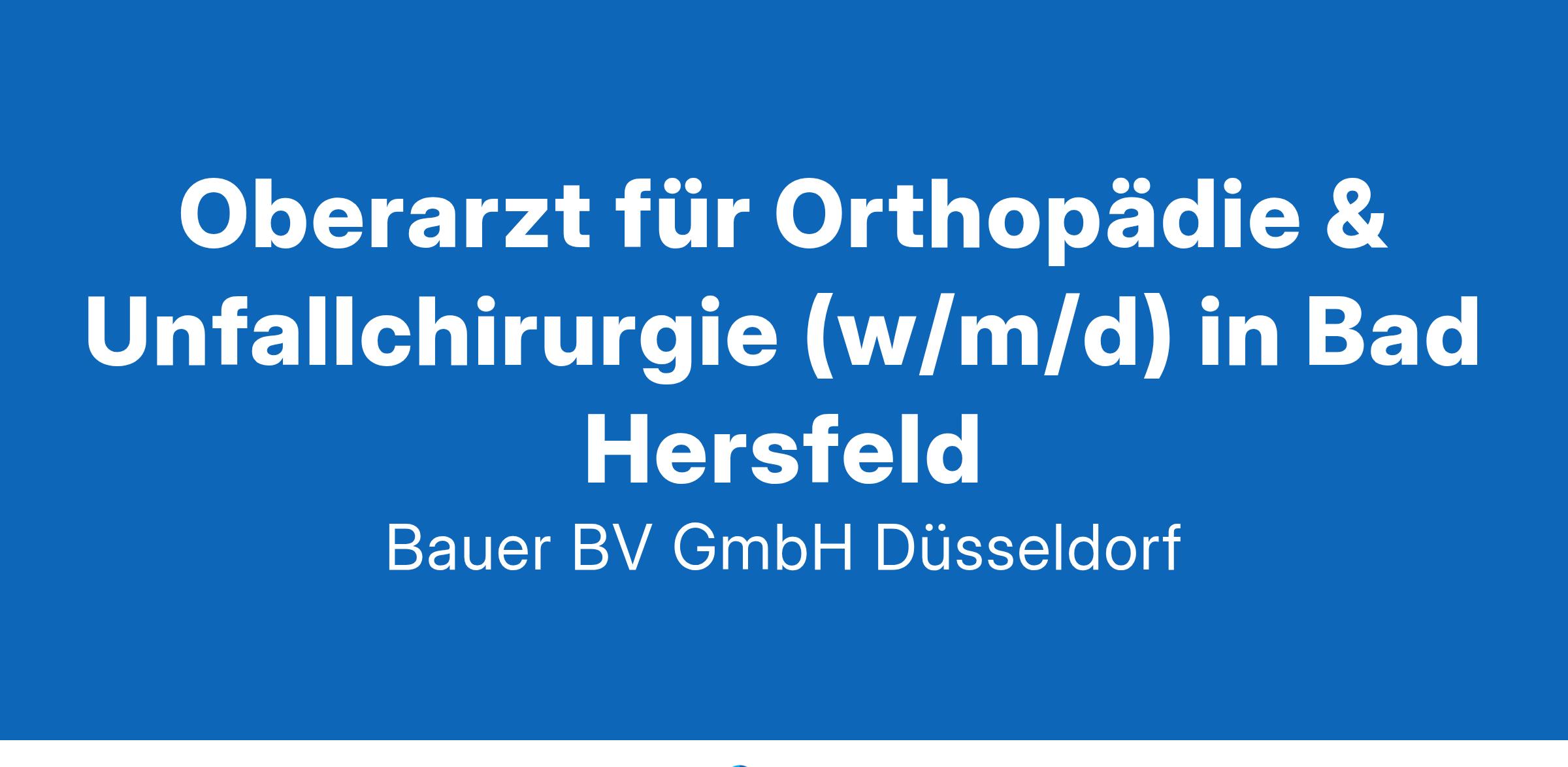 Anstellungsart(en): VollzeitIhr neuer Arbeitsplatz:Akademisches Lehrkrankenhaus mit rund 500 Betten in der Region Bad Hersfeld. Die Orthopädie und Unfallchirurgie behandelt das gesamte Spektrum der Fachbereiches. Es werden diverse konservative und operative Behandlungsmethoden eingesetzt.Ihre Vorteile:Verantwortungsvolle AufgabeBreit gefächertes AufgabengebietAngenehmes ArbeitsklimaWeiterbildungsermächtigungenAllgemeinchirurgie: 72 Monate24 Monate Basisweiterbildung36 Monate Allgemeinchirurgie12 Monate ViszeralchirurgieWeiterbildungsermächtigung Facharzt Orthopädie und Unfallchirurgie: 60 MonateAttraktive VergütungUnbefristete Anstellung mit PerspektiveIhr Profil:Facharzt für Orthopädie und Unfallchirurgie (m/w/d)Fundierte Kenntnisse in FachbereichEngagement und TeamfähigkeitIhr Ansprechpartner:Bauer B+V Personalberatung