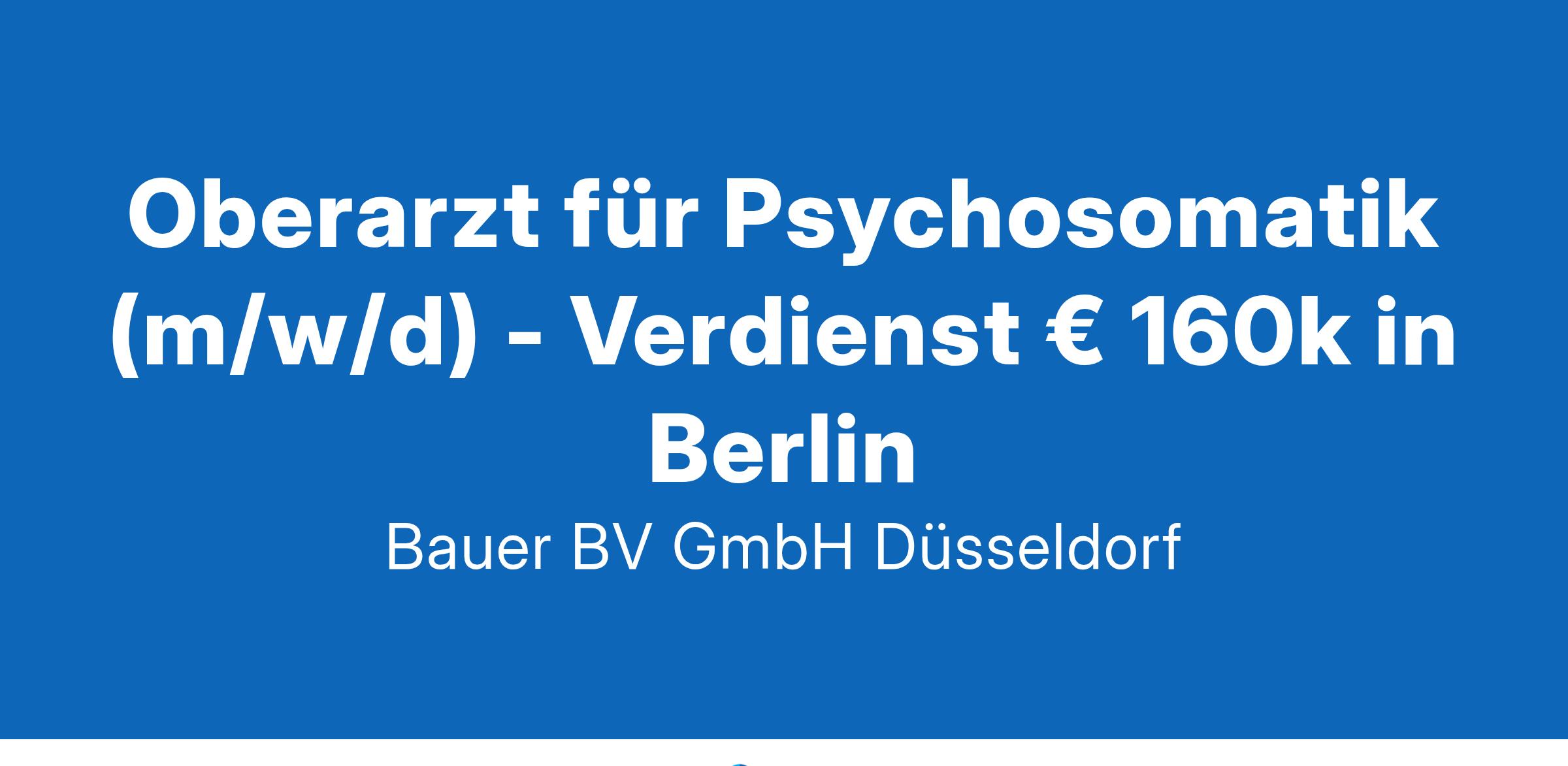 Standort: BerlinIhr neuer Arbeitsplatz:Für eine renommierte Klinik für Psychosomatische Medizin und Psychotherapie im Raum Berlin suchen wir einen Oberarzt für Psychosomatik (m/w/d).Ihre Vorteile:Abwechslungsreiches und spannendes TätigkeitsfeldPsychosomatische und psychotherapeutische PatientenversorgungLeitung interdisziplinärer TeambesprechungenWeiterbildung der AssistenzärzteViel Raum für MitgestaltungRegelmäßige interne und externe SupervisionAttraktive Vergütung von jährlich ca. € 160kUnbefristete AnstellungIhr Profil:Facharzt (m/w/d) für Psychosomatische Medizin und PsychotherapieSchwerpunkt auf psychodynamischer TherapieAusgeprägte Teamfähigkeit, Verantwortungsbewusstsein und EmpathieIhr Ansprechpartner:Bauer B+V Personalberatung