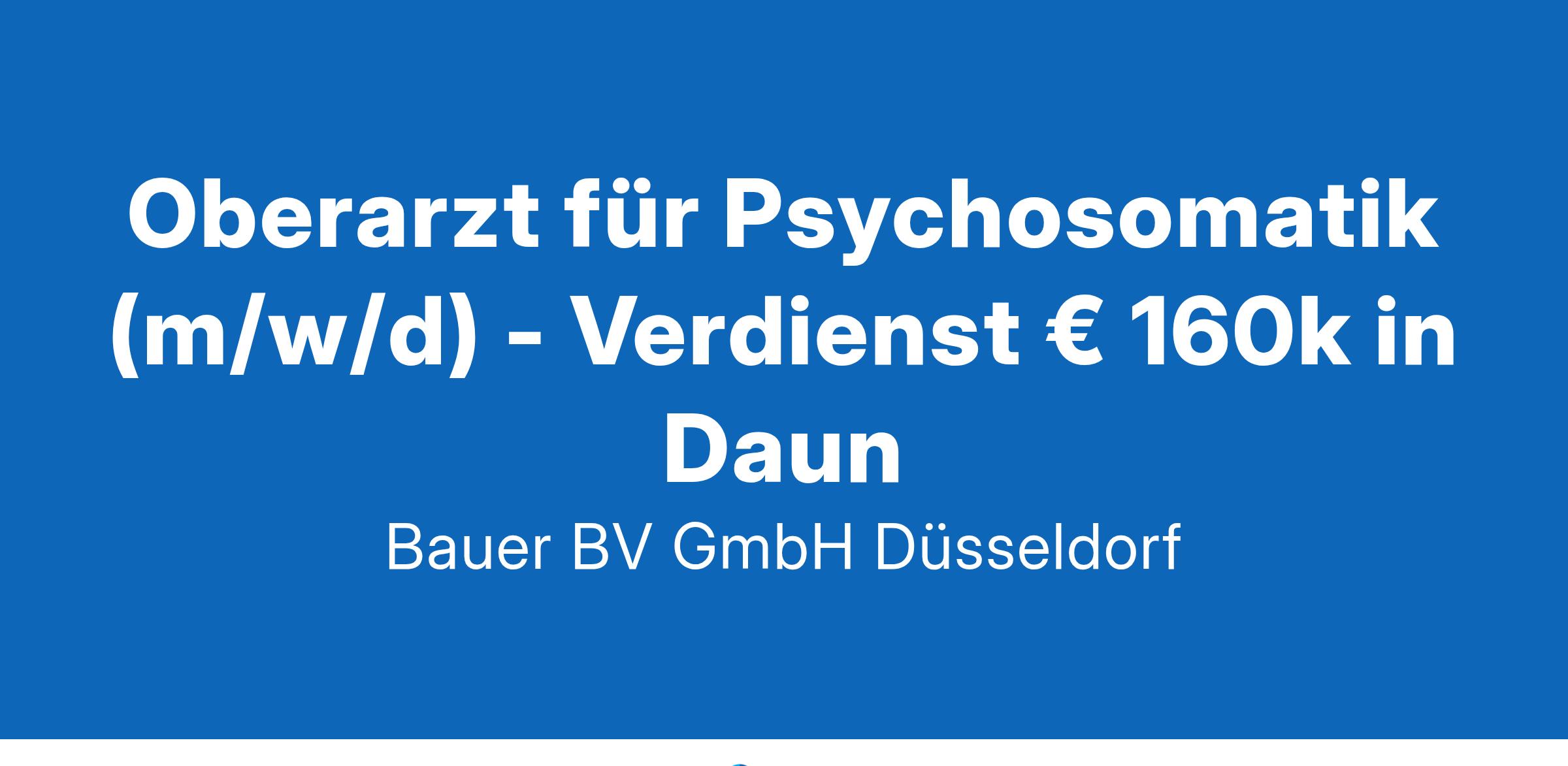 Standort: DaunIhr neuer Arbeitsplatz:Für eine renommierte Klinik für Psychosomatische Medizin und Psychotherapie im Raum Daun suchen wir einen Oberarzt für Psychosomatik (m/w/d).Ihre Vorteile:Abwechslungsreiches und spannendes TätigkeitsfeldPsychosomatische und psychotherapeutische PatientenversorgungLeitung interdisziplinärer TeambesprechungenWeiterbildung der AssistenzärzteViel Raum für MitgestaltungRegelmäßige interne und externe SupervisionAttraktive Vergütung von jährlich ca. € 160kUnbefristete AnstellungIhr Profil:Facharzt (m/w/d) für Psychosomatische Medizin und PsychotherapieSchwerpunkt auf psychodynamischer TherapieAusgeprägte Teamfähigkeit, Verantwortungsbewusstsein und EmpathieIhr Ansprechpartner:Bauer B+V Personalberatung