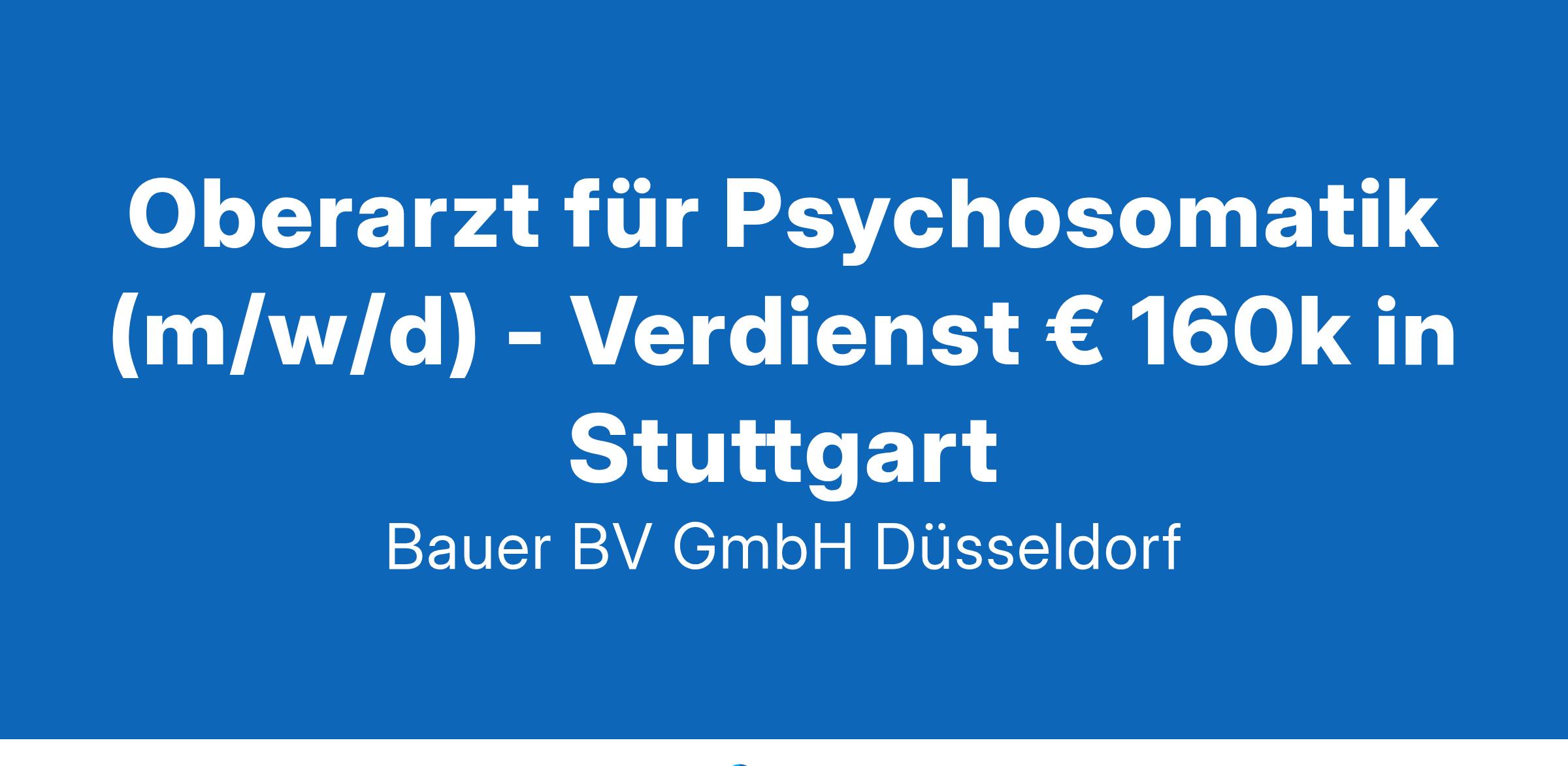 Standort: StuttgartIhr neuer Arbeitsplatz:Für eine renommierte Klinik für Psychosomatische Medizin und Psychotherapie im Raum Stuttgart suchen wir einen Oberarzt für Psychosomatik (m/w/d).Ihre Vorteile:Abwechslungsreiches und spannendes TätigkeitsfeldPsychosomatische und psychotherapeutische PatientenversorgungLeitung interdisziplinärer TeambesprechungenWeiterbildung der AssistenzärzteViel Raum für MitgestaltungRegelmäßige interne und externe SupervisionAttraktive Vergütung von jährlich ca. € 160kUnbefristete AnstellungIhr Profil:Facharzt (m/w/d) für Psychosomatische Medizin und PsychotherapieSchwerpunkt auf psychodynamischer TherapieAusgeprägte Teamfähigkeit, Verantwortungsbewusstsein und EmpathieIhr Ansprechpartner:Bauer B+V Personalberatung