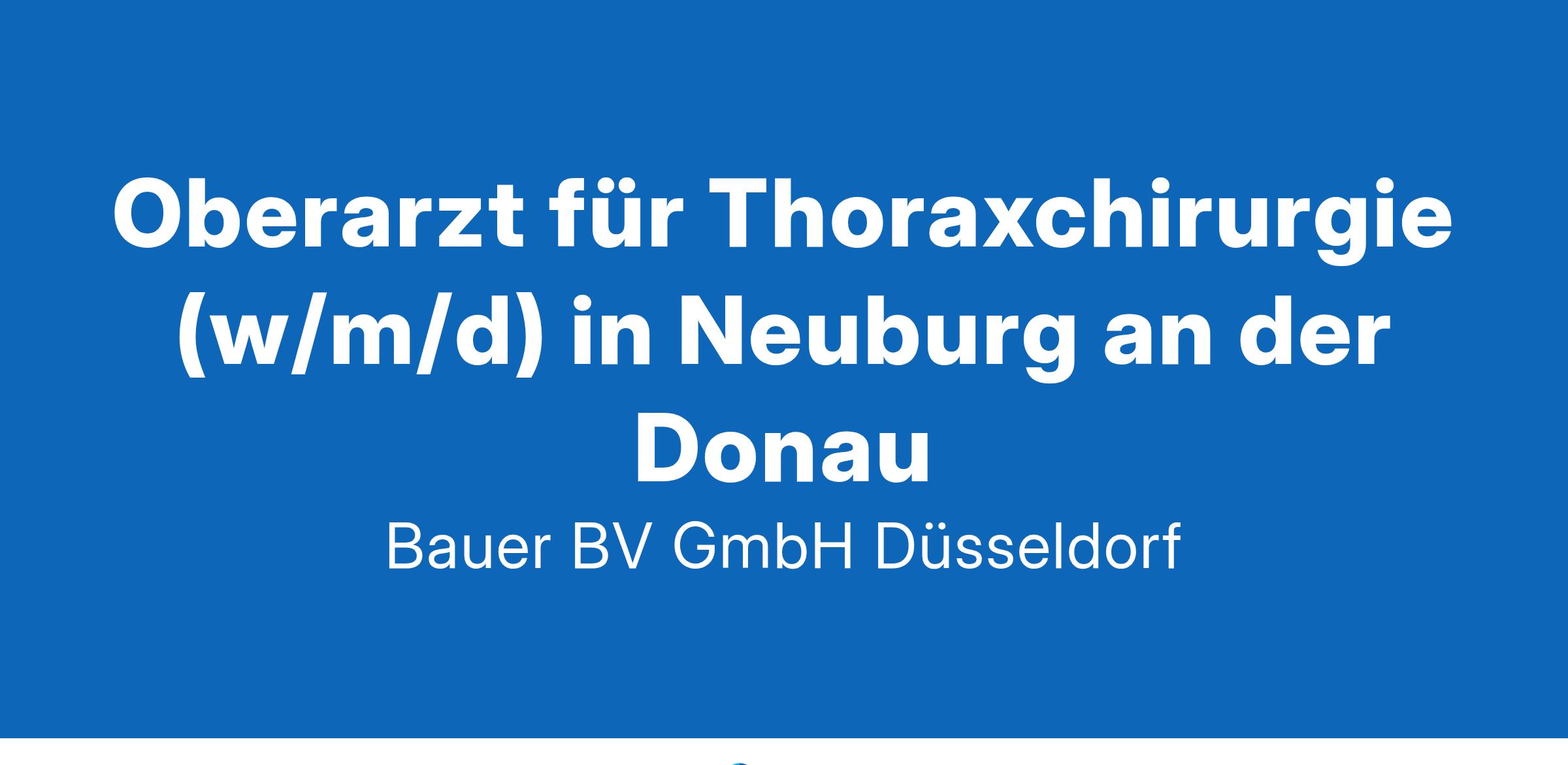Anstellungsart(en): VollzeitIhr neuer Arbeitsplatz:Akademisches Lehrkrankenhaus mit rund 1200 Betten und über 20 Fachabteilungen im Raum Neuburg an der Donau. Die Klinik für Allgemein-, Viszeral- und Thoraxchirurgie betreut das gesamte Spektrum des Fachgebietes, inkl. minimal-invasiver und roboter-gestützter Operationen. Krebserkrankungen des Darms, der Speiseröhre, der Bauchspeicheldrüse, der Leber und der Lunge bilden besondere Schwerpunkte.Ihre Vorteile:Verantwortungsvolle AufgabeEigenständige thoraxchirurgische EingriffeModerne AusstattungVinci Xi- SystemNd:YAG LaserAttraktive VergütungAngenehmes ArbeitsklimaUnbefristete Anstellung mit PerspektiveIhr Profil:Facharzt (w/m/d) für ThoraxchirurgieFundierte Kenntnisse auf dem gesamten GebietErfahrung in der minimalinvasiven ChirurgieEngagement und TeamfähigkeitIhr Ansprechpartner:Bauer B+V Personalberatung