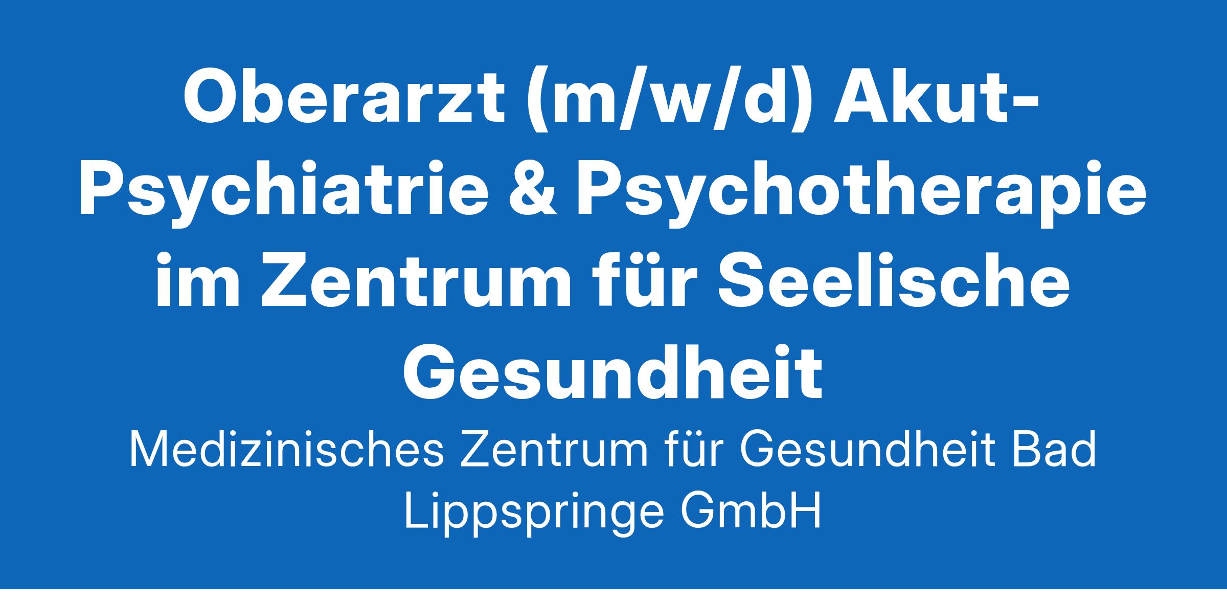 Oberarzt (m/w/d) Akut-Psychiatrie & Psychotherapie im Zentrum für Seelische GesundheitZum Zentrum für Seelische Gesundheit (ZSG) in Bad Lippspringe gehört die akut-psychiatrische Klinik für Seelische Gesundheit (KSG) sowie die Klinik am Park (KAP), eine Rehabilitationsklinik für Psychosomatik und Entwöhnungsbehandlung. Die Klinik für Seelische Gesundheit (KSG) hat einen Voll- und Pflichtversorgungsauftrag. Sie besteht aus Institutsambulanz, Tagesklinik (12 Plätze) und stationärem Bereich (40 Betten, im Aufbau).Wir suchen zum nächstmöglichen Termin einen Oberarzt (m/w/d) Akut-Psychiatrie & Psychotherapie .Ihre AufgabenBehandlung stationärer und ambulanter Patienten