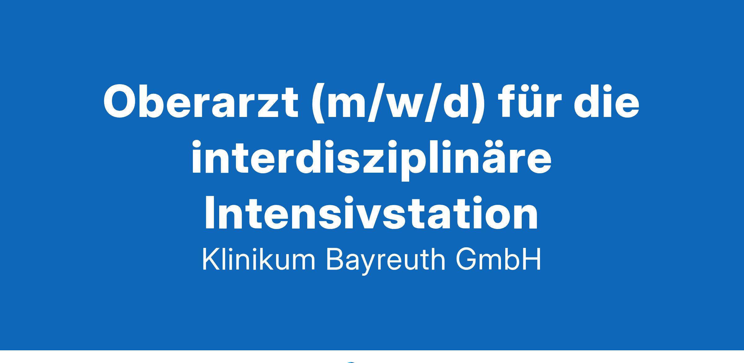 Die Klinikum Bayreuth GmbH erfüllt mit 28 Fachkliniken, 1.048 Betten und rund 3.500 Mitarbeitenden den Standard der Maximalversorgung und ist der führende Medizin-Dienstleister in Nordostoberfranken. Zudem ist die Klinikum Bayreuth GmbH mit ihren zwei Standorten in Bayreuth die überregional renommierte Anlaufstelle für Patientinnen und Patienten, die auf besonders hochwertige Versorgung Wert legen. Gemeinsam mit der Friedrich-Alexander-Universität Erlangen-Nürnberg, dem Universitätsklinikum Erlangen und der Universität Bayreuth steht die Klinikum Bayreuth GmbH für den Medizincampus Oberfranken. Hier absolvieren Medizin-Studierende den Klinischen Teil ihres Studiums. Damit bietet die Klinikum Bayreuth GmbH weit über die Region hinaus Diagnostik, Therapie, Forschung und Lehre auf universitärem Niveau und verbindet dies mit den Bedürfnissen und Anforderungen der Bevölkerung in Oberfranken nach einer umfassenden Gesundheitsversorgung. www.klinikum-bayreuth.deIhr ArbeitsbereichWir sind ein Krankenhaus der maximalen Versorgungsstufe. Wir decken nahezu das gesamte medizinische Spektrum ab - und das auf hohem Niveau. Wir gehören in vielen Disziplinen zu den Besten in Bayern und darüber hinaus. Wir sind Medizincampus, bei uns werden Ärztinnen und Ärzte von morgen ausgebildet. Wir setzen auf flache Hierarchien und auf Menschen, die sich engagieren.Das sind Ihre AufgabenIm Rahmen Ihres Medizinischen Verantwortungsbereiches sind Sie zuständig für die oberärztliche Versorgung der interdisziplinären Intensivstation.