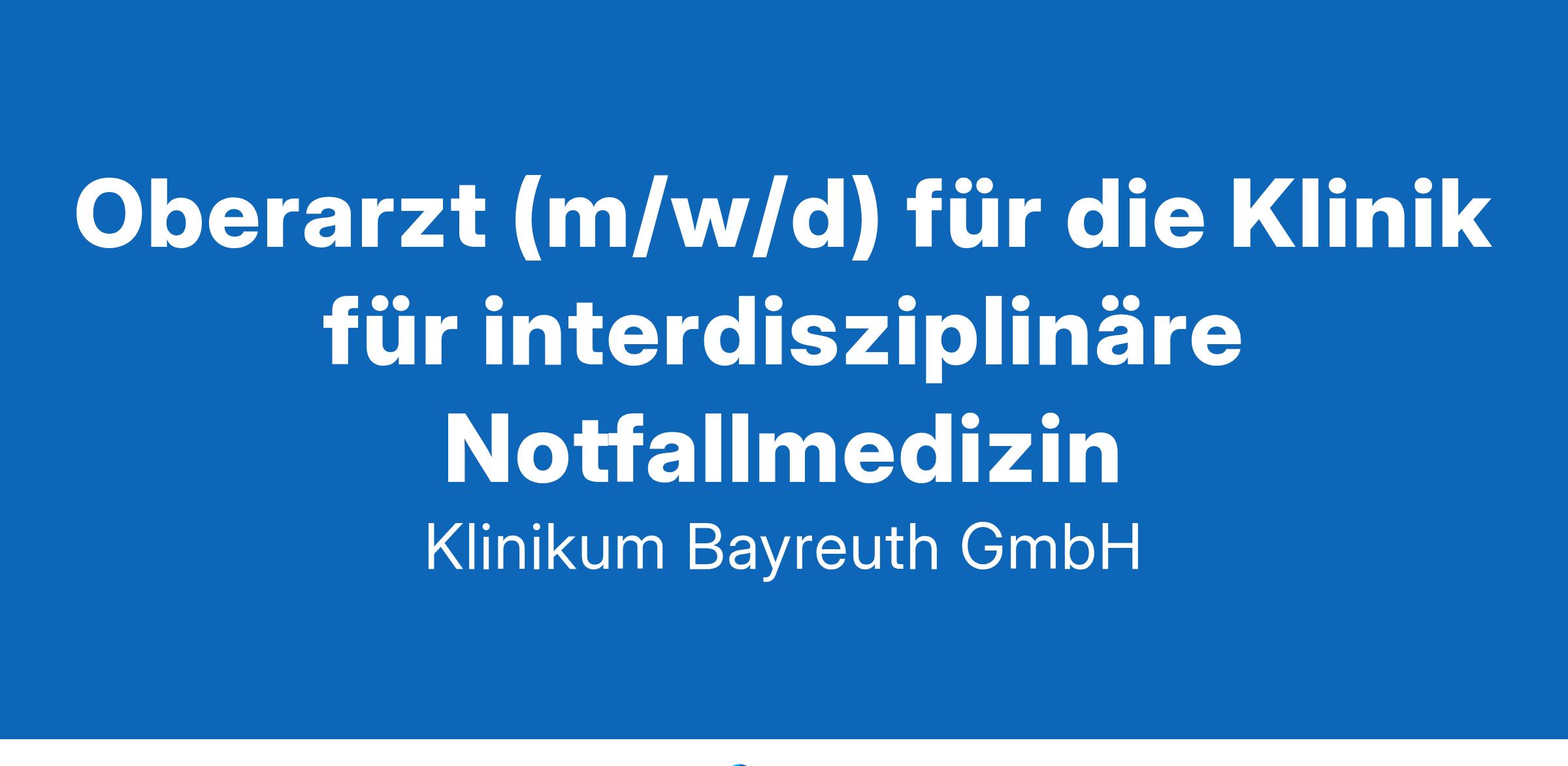 Die Klinikum Bayreuth GmbH erfüllt mit 27 Fachkliniken, 978 Betten und rund 3.500 Mitarbeitenden den Standard der Maximalversorgung und ist der führende Medizin-Dienstleister in Nordostoberfranken. Zudem ist die Klinikum Bayreuth GmbH mit ihren zwei Standorten in Bayreuth die überregional renommierte Anlaufstelle für Patientinnen und Patienten, die auf besonders hochwertige Versorgung Wert legen. Gemeinsam mit der Friedrich-Alexander-Universität Erlangen-Nürnberg, dem Universitätsklinikum Erlangen und der Universität Bayreuth steht die Klinikum Bayreuth GmbH für den Medizincampus Oberfranken. Hier absolvieren Medizin-Studierende den Klinischen Teil ihres Studiums. Damit bietet die Klinikum Bayreuth GmbH weit über die Region hinaus Diagnostik, Therapie, Forschung und Lehre auf universitärem Niveau und verbindet dies mit den Bedürfnissen und Anforderungen der Bevölkerung in Oberfranken nach einer umfassenden Gesundheitsversorgung. www.klinikum-bayreuth.deIhr ArbeitsbereichWir sind ein Krankenhaus der maximalen Versorgungsstufe. Wir decken nahezu das gesamte medizinische Spektrum ab - und das auf hohem Niveau. Wir gehören in vielen Disziplinen zu den Besten in Bayern und darüber hinaus. Wir sind Medizincampus, bei uns werden Ärztinnen und Ärzte von morgen ausgebildet. Wir setzen auf flache Hierarchien und auf Menschen, die sich engagieren.Das sind Ihre AufgabenAls Oberarzt (m/w/d) der Klinik für interdisziplinäre Notfallmedizin sind Sie der erste Ansprechpartner für unsere Patienten, übernehmen die Erstversorgung und initiieren die weiterführende Diagnostik und Behandlung.