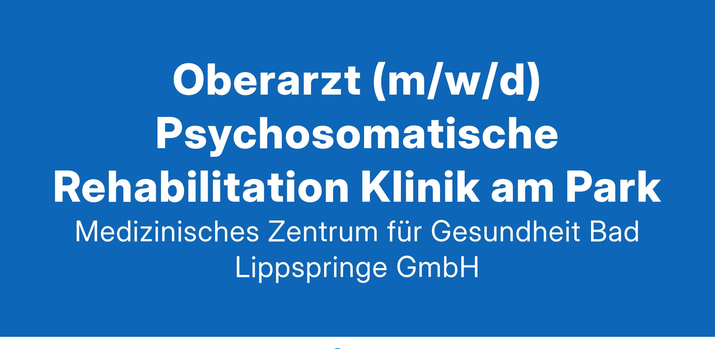 Oberarzt (m/w/d) Psychosomatische Rehabilitation Klinik am ParkZum Zentrum für Seelische Gesundheit (ZSG) in Bad Lippspringe gehört die akut-psychiatrische Klinik für Seelische Gesundheit (KSG) sowie die Klinik am Park (KAP), eine Rehabilitationsklinik für Psychosomatik und Entwöhnungsbehandlung. Die Klinik für Seelische Gesundheit (KSG) hat einen Voll- und Pflichtversorgungsauftrag. Sie besteht aus Institutsambulanz, Tagesklinik (12 Plätze) und stationärem Bereich (40 Betten, im Aufbau).Wir suchen zum nächstmöglichen Termin einen Oberarzt (m/w/d) Psychosomatische Rehabilitation im Zentrum für Seelische Gesundheit .Ihre AufgabenBehandlung stationärer und ambulanter Patienten