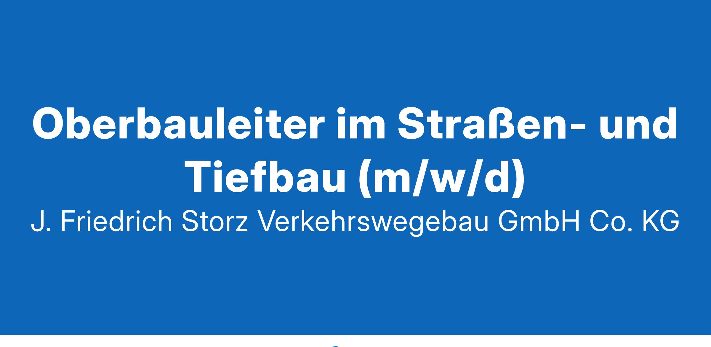 Werden Sie Teil des Storz-Teams für unseren Standort Sigmaringen oder Tuttlingen und bewerben Sie sich als Oberbauleiter im Straßen- und Tiefbau (m/w/d) Wie Sie unser Team unterstützen Selbständige Führung, Koordination und Steuerung der unterstellen Bauleiter (m/w/d) und Poliere (m/w/d) Eigenverantwortliche Abwicklung der Bauvorhaben von der Arbeitsvorbereitung bis zur Abnahme inkl. Abrechnung Verantwortung für Qualität, Termine, Kosten und Erlöse Unterstützung der Kalkulation, Nachtragskalkulation Koordination und Steuerung der internen und externen Beteiligten Disposition von Geräten und Arbeitsmitteln Beratung und Verhandeln mit Vertretern des Bauherrn Was Sie mitbringen Erfolgreich abgeschlossenes Studium des Bauingenieurwesens oder eine vergleichbare Ausbildung Mehrjährige Führungs- und Baustellenerfahrung Erfahrung in Projektarbeit Eigenverantwortliche und strukturierte Arbeitsweise, Durchsetzungsvermögen und Verbindlichkeit Unser Angebot an Sie Ein Umfeld, in dem die Werte eines Familienunternehmens und Bodenständigkeit auf Baustellen-Hightech und Innovationsgeist treffen Dienstwagen auch zur privaten Nutzung Eine kollegiale Arbeitsatmosphäre, in der der Mitarbeiter als Mensch im Mittelpunkt steht Viel Freiraum und Möglichkeiten zur persönlichen und fachlichen Weiterentwicklung Ein breites Spektrum an attraktiven Benefits wie z.B. Hansefit, Jobrad, übertarifliche Zulagen, das Storz-Vorsorgepaket und ein ausführliches Einarbeitungsprogramm Sie bringen Leidenschaft für Ihre Aufgaben mit? Dann freuen wir uns auf Ihre Bewerbung! J. Friedrich Storz Verkehrswegebau GmbH & Co. KG