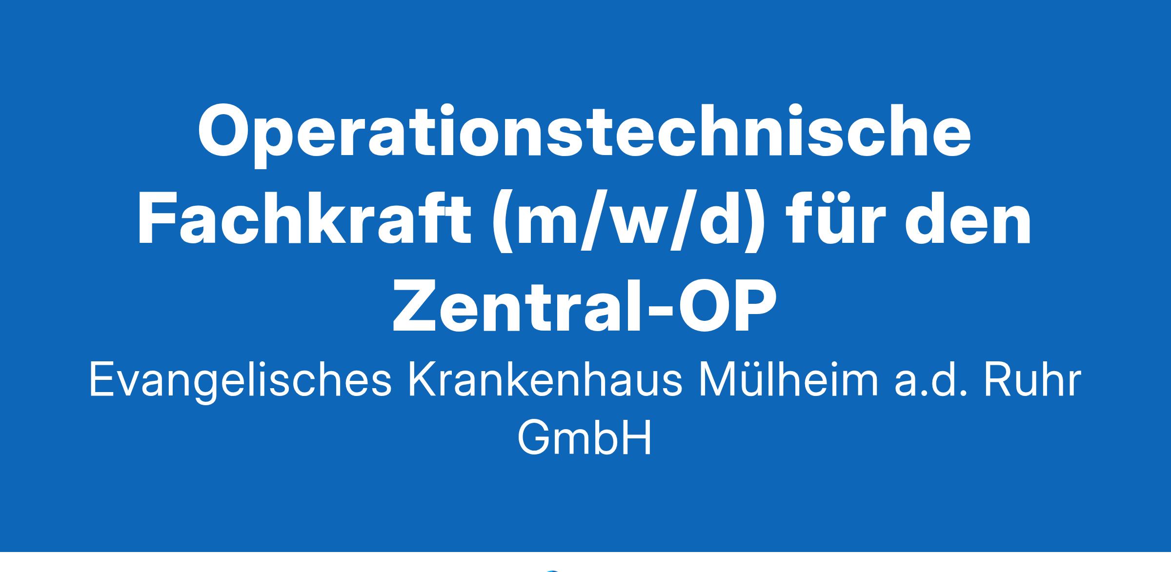 Karriere im Evangelischen Krankenhaus MülheimWir bieten unseren Mitarbeitenden ein professionelles und modernes Arbeitsumfeld. Ein angenehmes Arbeitsklima sowie ein guter Teamgeist sind für uns selbstverständlich. Die Kompetenz und die Motivation unserer Mitarbeitenden sind uns sehr wichtig: Daher unterstützen wir unsere Mitarbeitenden mit hochprofessionellen Fort- und Weiterbildungen in ihrer beruflichen und persönlichen Weiterentwicklung. In unseren Kliniken fühlen wir uns dem Menschen verpflichtet, unabhängig davon, ob es sich um Mitarbeitende, Patientinnen und Patienten oder um Angehörige handelt. Unser Miteinander gestalten wir auf Basis unserer gemeinsamen Werte. Das heißt unter anderem, dass wir jedem Menschen mit Respekt begegnen, in den offenen Austausch gehen und verlässlich in unseren Entscheidungen sind. Wir übernehmen Verantwortung gegenüber Anderen und gestalten gemeinsam nachhaltig unsere Zukunft. Zur Verstärkung unseres engagierten Teams im Zentral-OP suchen wir zum nächstmöglichen Zeitpunkt einen OTA – Operationstechnischen Assistenten (m/w/d)