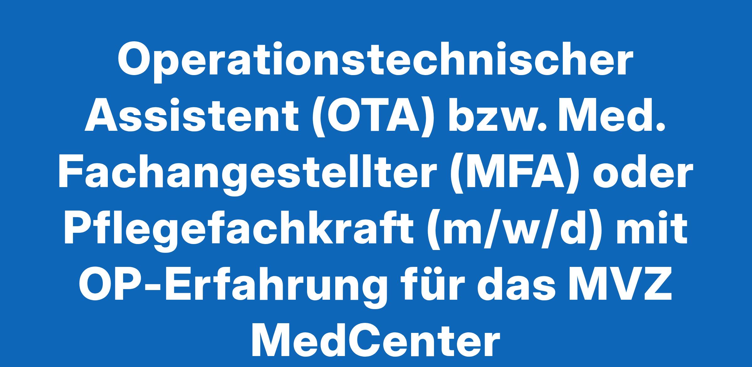 Operationstechnischer Assistent (OTA) bzw. Med. Fachangestellter (MFA) oder Pflegefachkraft (m/w/d) mit OP-Erfahrung für das MVZ MedCenter
