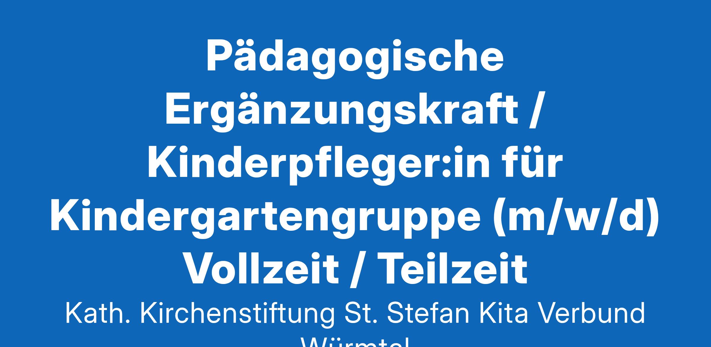 Pädagogische Ergänzungskraft / Kinderpfleger:in für Kindergartengruppe (m/w/d) Vollzeit / Teilzeit Päd. Ergänzungskraft / Kinderpfleger:in (m/w/d) für Kindergartengruppe Für unsere Einrichtungen in Gräfelfing, Stockdorf, Gauting und Gilching suchen wir Unterstützung. Diese sind Teil des Kita-Verbundes Würmtal. In insgesamt acht Einrichtungen werden mehr als 500 Kinder im Alter von drei Jahren bis zum Übertritt an weiterführende Schulen betreut. Arbeitsumfang: Vollzeit oder Teilzeit Beginn: ab sofort - nach Absprache Mögliche Einsatzorte: Kinderhaus St. Stefan Gräfelfing | Bahnhofstr. 8 | 82166 Gräfelfing Kinderhaus St. Josef Gauting | Reismühler Str. 17 | 82131 Gauting Kinderhaus St. Sebastian Gilching | Schergenamtsweg 5 | 82205 Gilching Kindergarten St. Vitus Stockdorf | Waldstr. 24 | 82131 Stockdorf Auf Sie wartet ein attraktives Gehaltspaket gem. Tarifvertrag bestehend aus Grundgehalt, SuE-Zulage, Ballungsraumzulage Jährliche Jahressonderzahlung und Einmalzahlung Zusatzversorgung bei der Bayerischen Versorgungskammer, betriebliche Altersvorsorge, vermögenswirksame Leistungen ein unbefristeter Arbeitsvertrag 30 Tage Urlaub, arbeitsfreie Tage an Heilig Abend und Silvester sowie 1/2 Tag am Faschingsdienstag 2 zusätzliche Regenerationstage sowie die Möglichkeit zur Umwandlung der SuE-Zulage in zwei weitere freie Tage Freistellung und Kostenübernahmen für Fort- und Weiterbildungen EGYM Wellpass (Firmenfitnessangebot) - Nutzung von mehr als 9.000 Sport-, Wellness- und Gesundheitseinrichtungen mit vielfältigem Angebot Corporate Benefits (Sonderkonditionen auf Produkte und Dienstleistungen von über 600 namhaften Anbietern) Ein toller Teamspirit mit großer Wertschätzung die Möglichkeit zur persönlichen Weiterentwicklung ein positives Arbeitsumfeld mit einem beständigen, engagierten und aufgeschlossenen Team Wir wünschen uns, dass Sie über einen entsprechenden pädagogischen Abschluss oder eine vergleichbare anerkannte Ausbildung verfügen, z.B. staatlich anerkannte Kinderpflegerin (m/w/d), Sozialassistent/in (m/w/d) oder für Kindergarten anerkannter Abschluss bereits Erfahrung in der Arbeit mit Kindergartenkinder haben liebevoll und wertschätzend mit den Kindern umgehen in respektvoller und empathischer Interaktion mit den Eltern stehen zuverlässig sind, Eigeninitiative und Teamfähigkeit mitbringen und sich mit den Werten einer katholischen Einrichtung identifizieren können, dabei ist unerheblich welche Konfession Sie haben Sie möchten uns und unsere Arbeit kennenlernen? Melden Sie sich gerne per Mail bei uns. Die jeweilige Leitung wird sich bei Ihnen melden. Wir freuen uns auf Ihre Kontaktaufnahme! Wir freuen uns auf Ihre Bewerbungsunterlagen per Mail oder per Post an: Kath. Kirchenstiftung St. Stefan – Kita Verbund Würmtal Melanie Häringer | Bahnhofstr. 18, 82166 Gräfelfing Mail: kitaverbund-wuermtal@kita.ebmuc.de | www.kita-verbund-wuermtal.de