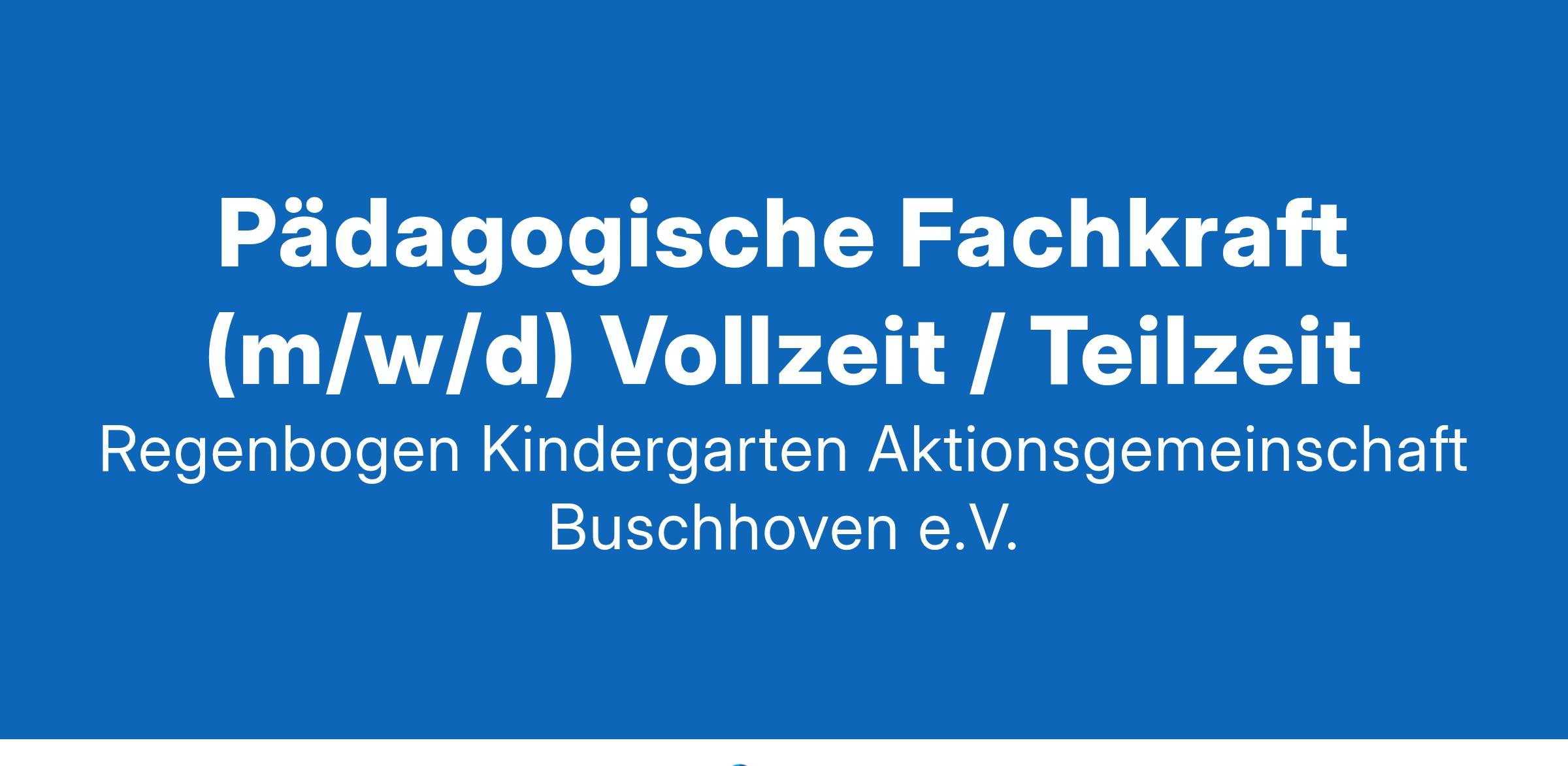 Pädagogische Fachkraft (m/w/d) Vollzeit / Teilzeit Die Stelle ist unbefristet zu besetzen Das wünschen wir uns: Sie haben eine abgeschlossene Ausbildung als staatlich anerkannte/r Erzieher/in oder eine vergleichbare Qualifikation Sie sind teamorientiert, verantwortungsbewusst, zuverlässig und engagiert Sie begeistern sich für die Arbeit mit Kindern und können sich auf deren Bedürfnisse und Interessen einstellen Sie haben kreative Ideen mitzuwirken Sie tauschen sich selbstverständlich mit Eltern und Kollegen aus Wir sind eine viergruppige Einrichtung mit 75 Kindern und betreuen die Altersgruppe 1 bis 6 Jahre in einer seit über 50 Jahren etablierten gemeinnützigen Elterninitiative. Im Mittelpunkt unserer täglichen Arbeit steht das einzelne Kind. Wir möchten ein vertrauensvolles Miteinander zwischen Kindern, Eltern und Erziehern aufbauen. Ein gutes Arbeitsklima und wertschätzender Umgang sind uns wichtig. In unserem Regenbogen finden Sie die zahlreichen Vorteile, die wir unserem Team bieten. Lernen Sie uns kennen unter: http://www.regenbogen-swisttal.de. Haben wir Ihr Interesse geweckt? Dann melden Sie sich gerne per E-Mail mit Ihren aussagekräftigen Bewerbungsunterlagen: unter vorstand@regenbogen-swisttal.de. Wir freuen uns auf Sie! Bei telefonischen Vorabanfragen erreichen Sie unsere Kindergartenleiterin, Frau Breuer, zu unseren Öffnungszeiten. Regenbogen-Kindergarten Aktionsgemeinschaft Buschhoven e.V. Birkenweg 24a – 53913 Swisttal – Telefon 02226 / 3836 Fax 02226 / 157725 info@regenbogen.swisttal.de – www.regenbogen-swisttal.de