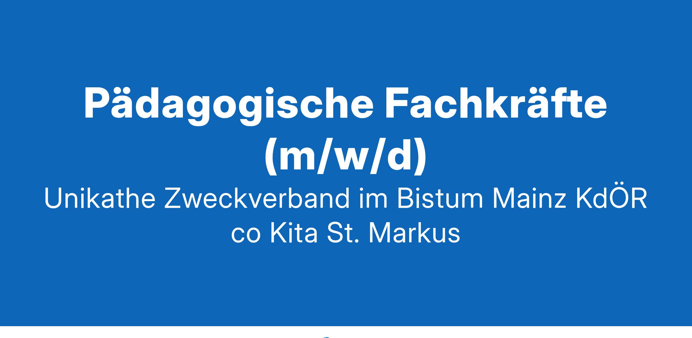 in Vollzeit oder Teilzeit (mind. 25 Std./Woche) Wir bieten Ihnen mit dieser Stellenausschreibung eine tolle Möglichkeit an, um sich weiterzuentwickeln. In unserer Kindertageseinrichtung St. Markus betreuen wir bis zu 110 Kinder im vom 10. Lebensmonat bis zum Schuleintritt. Unser schönes Haus steht in Mühlheim in zentraler Lage und verfügt über ein großes schönes Außengelände und eine gute Verkehrsanbindung. Wir orientieren uns an den Leitlinien und Werten des christlichen Menschenbildes. Unser Erziehungsbild ist ganzheitlich und von einer partizipativen Grundhaltung geprägt. Die Kita zeichnet sich durch ein motiviertes und engagiertes Team, ein sehr gutes Betriebsklima, aktive Eltern und einer gut fundierten Pädagogik aus.Das sind Ihre Aufgaben: Sie begleiten Kinder in ihren Entwicklungs- und Lernprozessen und gestalten anregende Bildungsräume Sie nehmen jedes Kind in seiner Persönlichkeit und individuellen Entwicklung wahr Sie beobachten und dokumentieren die individuelle Entwicklung der Kinder Sie richten Angebote und Projekte an Ihren Beobachtungen und der gemeinsamen Reflexion im Team aus Sie sind offen für einen engen und regelmäßigen Austausch mit den Eltern Sie bringen sich aktiv in Teambesprechungen und die Weiterentwicklung unserer Konzeption ein Sie erweitern Ihr Wissen durch regelmäßige Fortbildungen Was wir erwarten: Eine abgeschlossene Ausbildung als staatlich anerkannte/-r Erzieher/-in, Sozialpädagoge/-in oder eine vergleichbare anerkannte Ausbildung als pädagogische Fachkraft (gerne auch Berufsanfänger/-innen) Einen wertschätzenden und begleitenden Umgang mit Kindern auf ihrem Weg in die Selbstständigkeit Sie bringen sich und Ihre Ideen ein und gestalten den pädagogischen Alltag aktiv mit Sie sind interessiert an persönlicher und fachlicher Weiterentwicklung Sie besitzen die Fähigkeit, im Team zu agieren und konzeptionell zu arbeiten Sie bauen Erziehungspartnerschaften mit Eltern auf Zugehörigkeit zu einer christlichen Kirche Identifikation mit und Bereitschaft, die Aufgaben, Ziele und Werte des katholischen Unikathe Kita-Zweckverbandes mitzutragen und an deren Erfüllung mitzuarbeiten Deutschkenntnisse Level C1 Was Sie erwartet: Vergütung gem. AVR des Dt. Caritasverbandes incl. Jahressonderzahlung Arbeitsmarktzulage (auf Höhe S 8b TVöD SuE) Kirchliche Zusatzversorgung (Betriebsrente) Anerkennung von Vorzeiten möglich 30 Tage Urlaub (bei einer 5-Tage-Woche) Fortbildung- und Weiterbildungsmöglichkeiten Supervision Regelmäßige Vorbereitungszeiten, Gruppenbesprechungen und Teamsitzung Möglichkeit zu Exerzitien/Besinnungstage/Bildungsurlaub Wertschätzende Arbeitsatmosphäre Tätigkeiten in einer Kita mit individueller Ausrichtung Ein Arbeitsplatz inmitten der Rhein-Main Metropole, die sowohl die städtischen wie auch die ländlichen Vorteile in sich vereint Sie sind interessiert? Dann freuen wir uns auf Ihre schriftliche Bewerbung!Per E-Mail: