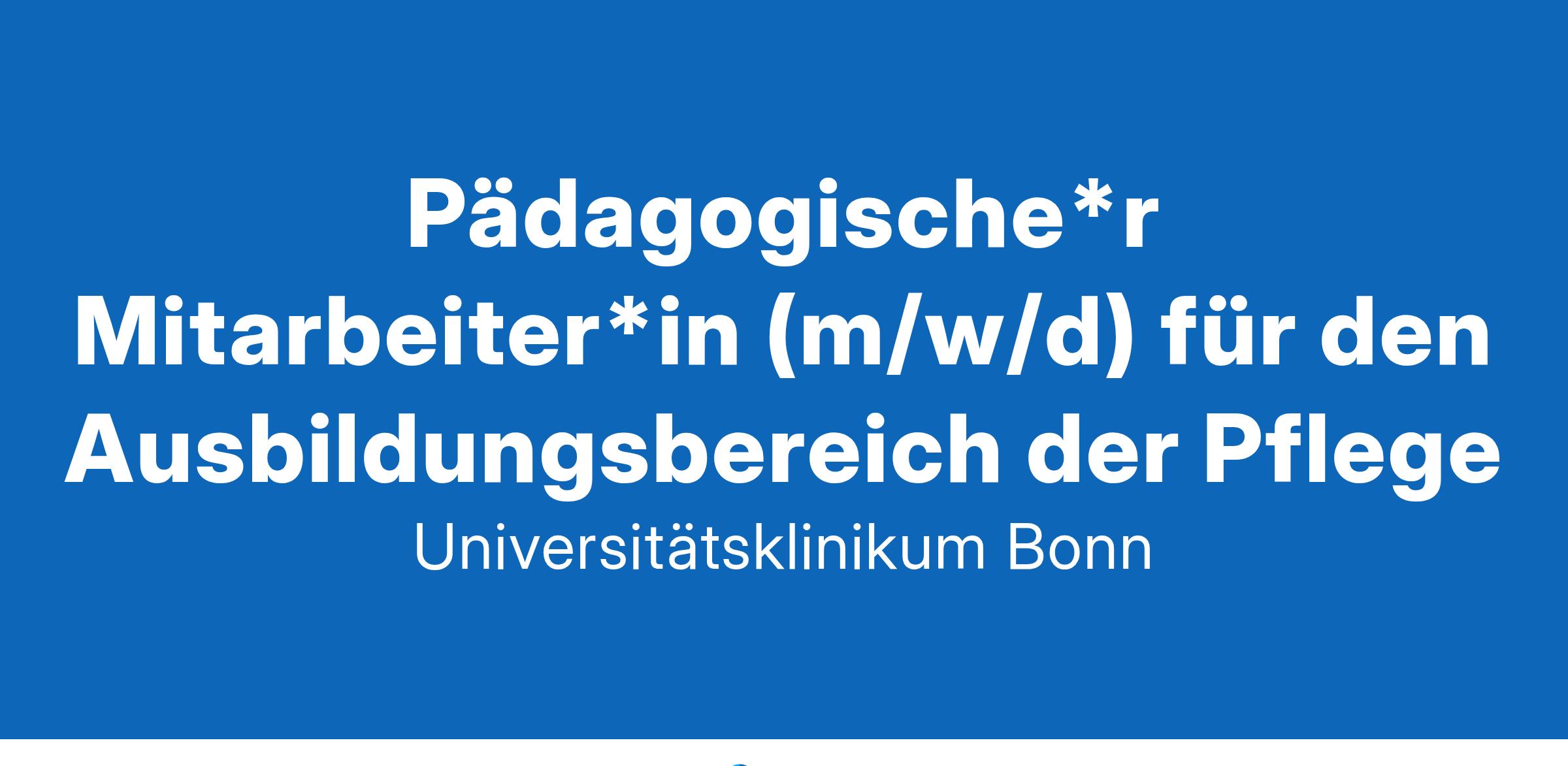 Im UKB werden pro Jahr etwa 500.000 Patient*innen betreut, es sind ca. 9.000 Mitarbeiter*innen beschäftigt und die Bilanzsumme beträgt 1,6 Mrd. Euro. Neben den über 3.300 Medizin- und Zahnmedizin-Studierenden werden pro Jahr weitere 585 Personen in zahlreichen Gesundheitsberufen ausgebildet. Das UKB steht im Wissenschafts-Ranking sowie in der Focus-Klinikliste auf Platz 1 unter den Universitätsklinika (UK) in NRW und weist den dritthöchsten Case Mix Index (Fallschweregrad) in Deutschland auf. Zur professionellen Verstärkung des Teams im Ausbildungszentrum für Pflegeberufe am Centrum für Aus- und Weiterbildung des UKB suchen wir zum 01.04.2025 in Vollzeit (38,5 Std./Woche) eine*n engagierte*n Pädagogische*n Mitarbeiter*in (m/w/d) für den Ausbildungsbereich der Pflege Die Stelle ist unbefristet zu besetzen. Ihre Aufgaben: Pädagogische und fachliche Leitung der Kurse in der generalistischen Pflegeausbildung Übernahme des theoretischen und praktischen Unterrichts Begleitung der Auszubildenden in den praktischen Einsatzgebieten Organisation, Planung und Evaluation von Lehrveranstaltungen Mitarbeit an der konzeptionellen Weiterentwicklung der curricularen Ausbildungsstruktur Mitarbeit an umfassenden Schulentwicklungsprozessen Ihr Profil: Ausbildung in der Gesundheits- und Krankenpflege bzw. Gesundheits- und Kinderkrankenpflege Abgeschlossenes oder laufendes Studium der Pflegepädagogik bzw. ein gleichwertiges berufspädagogisches Hochschulstudium (Diplom/Master) Begeisterung und Freude an der pädagogischen Tätigkeit im Ausbildungsbereich der Pflege Die Fähigkeit zur interdisziplinären und interprofessionellen Zusammenarbeit Kreativität, Engagement und Innovationsbereitschaft für die Mitgestaltung und Einführung neuer Ausbildungskonzepte Erfahrung in der Entwicklung und Umsetzung kompetenzorientierter Unterrichtskonzepte Wir bieten: Verantwortungsvoll und vielseitig: ein Arbeitsplatz mit großem Gestaltungsspielraum in einem kollegialen Team Sicher in der Zukunft: Entgelt nach TV-L Flexibel für Familien: flexible Arbeitszeitmodelle, Möglichkeit auf einen Platz in der Betriebskindertagesstätte und Angebote für Elternzeitrückkehrer*innen Vorsorgen für später: betriebliche Altersvorsorge Clever zur Arbeit: Möglichkeit eines zinslosen Darlehens zur Anschaffung eines E-Bikes Bildung nach Maß: geförderte Fort- und Weiterbildung Start mit System: strukturierte Einarbeitung Gesund am Arbeitsplatz: zahlreiche Angebote der Gesundheitsförderung, kostenlose Mitgliedschaft im UKB-Fitnessstudio Arbeitgeberleistungen: vergünstigte Angebote für Mitarbeiter*innen (Corporate Benefits) Wir setzen uns für Diversität und Chancengleichheit ein. Unser Ziel ist es, den Anteil von Frauen in Bereichen, in denen Frauen unterrepräsentiert sind, zu erhöhen und deren Karrieren besonders zu fördern. Wir fordern deshalb einschlägig qualifizierte Frauen nachdrücklich zur Bewerbung auf. Bewerbungen werden in Übereinstimmung mit dem Landesgleichstellungsgesetz behandelt. Die Bewerbung geeigneter Menschen mit nachgewiesener Schwerbehinderung und diesen gleichgestellten Personen ist besonders willkommen. Kontakt: Sie erfüllen unsere Anforderungen und suchen eine abwechslungsreiche und herausfordernde Tätigkeit? Zögern Sie nicht und senden Sie Ihre aussagekräftige Bewerbung (bevorzugt per E-Mail in einer Datei bis 5 MB Größe) bis zum 30.01.2025 unter Angabe der Stellenanzeigen-Nr. ST-14071 an: Herr Dr. Christoph Sebastian Nies Schulleitung Ausbildungszentrum für Pflegeberufe Universitätsklinikum Bonn Venusberg-Campus 1 53127 Bonn E-Mail: Sebastian.Nies@ukbonn.de www.ukbonn.de Folgen Sie uns auf Instagram: