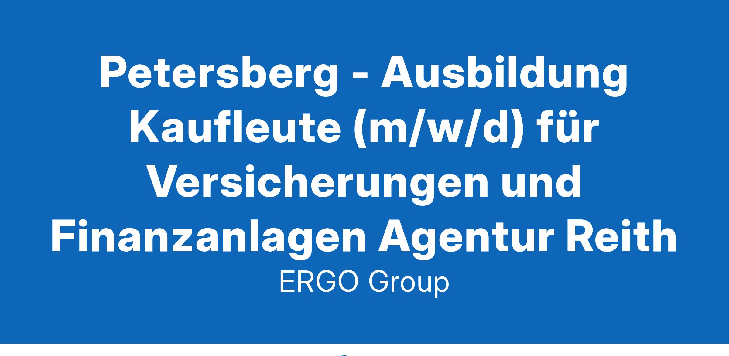 Petersberg - Ausbildung Kaufleute (m/w/d) für Versicherungen und Finanzanlagen Agentur ReithDu hast Spaß am Umgang mit Menschen? Du arbeitest gern eigenverantwortlich und gibst alles für Deine beruflichen Ziele? Bestens – wir suchen Dich! Komm zu ERGO und schaffe die Basis für eine aussichtsreiche Karriere.Menschen verstehen und gemeinsam Lösungen entwickeln