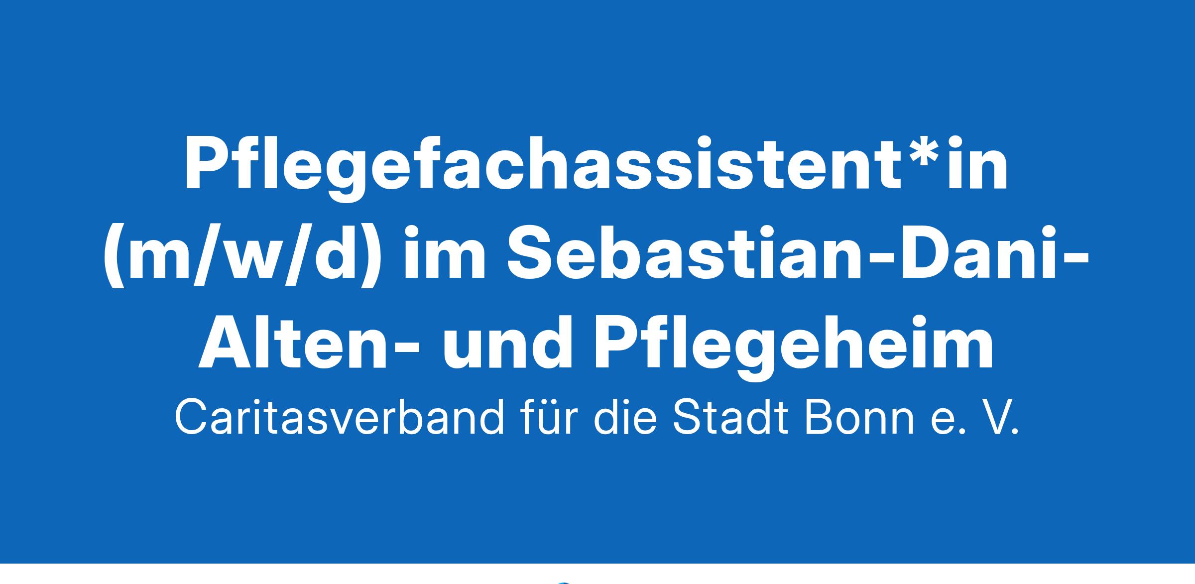 Der Caritasverband für die Stadt Bonn e.V. ist der örtliche Wohlfahrtsverband der Katholischen Kirche. Mit mehr als 1.100 Mitarbeitenden bieten wir nach unserem Motto „Not sehen und handeln“ Unterstützung für Menschen in den Bereichen Kinder, Jugend und Familie, Integration und Rehabilitation sowie Leben und Wohnen in Alter und Krankheit. In unseren über 60 unterschiedlichen Einrichtungen und Diensten begleiten wir die Menschen je nach persönlicher Lebenssituation. Als Partner der Stadtgesellschaft fördern wir aktiv das soziale Miteinander und die gesellschaftliche Teilhabe für alle Menschen in der Bundesstadt Bonn.Das Sebastian-Dani-Alten- und Pflegeheim im Herzen von Bonn-Poppelsdorf bietet Lebensraum für 86 Bewohner*innen für Hilfs- und pflegebedürftige Seniorinnen und Senioren aus dem Bereich der somatischen und gerontopsychiatrischen Pflege. Bewohner*innen mit einem zusätzlichen Betreuungsbedarf aufgrund von demenziellen Veränderungen erfahren im eigens geschützten Wohnbereich besondere Zuwendung. Wir bieten unseren Bewohner*innen ein vielfältiges Betreuungsangebot. Dabei stehen die Teilhabe und die Möglichkeit, ein selbstbestimmtes Leben zu führen, im Mittelpunkt.Zur Unterstützung unseres Teams suchen wir ab sofort einePflegefachassistent*in (m/w/d) im Sebastian-Dani-Alten- und Pflegeheimin Voll- oder Teilzeit.