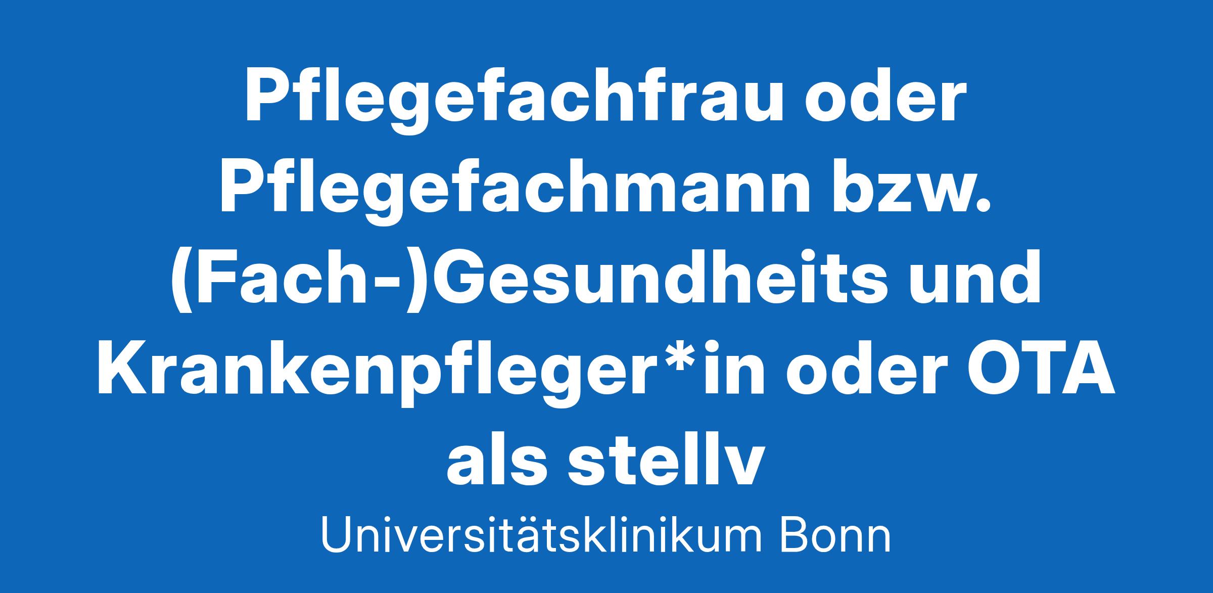Im UKB werden pro Jahr etwa 500.000 Patient*innen betreut, es sind ca. 9.000 Mitarbeiter*innen beschäftigt und die Bilanzsumme beträgt 1,6 Mrd. Euro. Neben den über 3.300 Medizin- und Zahnmedizin-Studierenden werden pro Jahr weitere 585 Personen in zahlreichen Gesundheitsberufen ausgebildet. Das UKB steht im Wissenschafts-Ranking sowie in der Focus-Klinikliste auf Platz 1 unter den Universitätsklinika (UK) in NRW und weist den dritthöchsten Case Mix Index (Fallschweregrad) in Deutschland auf. Für den Hybrid-OP in der Kinderkardiologie suchen wir zum nächstmöglichen Zeitpunkt in Vollzeit (38,5 Std./Woche)/Teilzeit eine/n Pflegefachfrau oder Pflegefachmann bzw. (Fach-)Gesundheits- und Krankenpfleger*in oder OTA als stellvertretende Fachbereichsleitung (m/w/d) Die Stelle ist unbefristet zu besetzen. Was macht den OP-Bereich Kinderkardiologie aus? Zusammenarbeit im interprofessionellen Team individuelle Dienstlänge bis hin zu 12 h-Diensten möglich Arbeitsbereich im modernen Eltern-Kind-Zentrum Ihre Aufgaben: Sie führen gemeinsam ein Pflegeteam und stellen sicher, dass Prozesse reibungslos funktionieren Sie koordinieren die interdisziplinäre und berufsgruppenübergreifende Zusammenarbeit Sie sichern die Pflegequalität (gesetzliche Vorgaben, Hygiene) Sie dokumentieren notwendige Daten sach- und fachgerecht Sie ermöglichen gemeinsam die Entwicklung Ihrer Mitarbeiter im Sinne der Gesamtzielsetzung des UKB Ihr Profil: Eine abgeschlossene Ausbildung zur Gesundheits- und Krankenpflegekraft oder OTA Ein abgeschlossenes Pflegestudium oder eine vergleichbare Qualifikation wäre von Vorteil Eine abgeschlossene Fachweiterbildung in der Operationspflege oder Sie befinden sich in der Maßnahme Berufserfahrung im Bereich Operationspflege und Erfahrung in leitender Funktion Belastbarkeit, eine selbstständige Arbeitsweise sowie Patienten- und Ergebnisorientierung Ein ausgeprägtes interkulturelles und genderspezifisches Verständnis Interesse an neuen Fachinhalten, Organisationsveränderungen und der Weiterentwicklung der Operationspflege Wir bieten: Gestalten Sie mit uns die Zukunft der Pflege! Wir sind der Arbeitgeber für alle, die mehr wollen. Mehr Abwechslung, mehr Herausforderung, mehr Perspektiven. Mind. 30 Urlaubstage + 9 Zusatzurlaubstage bei Wechselschicht zzgl. Entlastungstage nach TV-E Bezahlung nach TV-L: tarifliche Vergütung inkl. Jahressonderzahlung, betriebliche Altersvorsorge Prämiensystem: Zusatzentlohnung für kurzfristige Einsätze innerhalb von 96 h, Zulagen von bis zu 500 € für Mitarbeiter*innen mit Fachweiterbildung und ausgewählten Zusatzqualifikationen Flexibel für Familien: flexible Arbeitszeitmodelle, Betriebskindertagesstätte und Angebote für Elternzeitrückkehrer*innen Clever zur Arbeit: gute Anbindung an das SWB-Netz, Möglichkeit eines zinslosen Darlehens zur Anschaffung eines E-Bikes Individuelle Pflegekarriere: strukturierte Einarbeitung und Pflegekarriereplanung, geförderte Fort- und Weiterbildung auf dem Campus, Studienförderung Patientenversorgung im Mittelpunkt: dank unterschiedlicher Servicedienste im Bereich Catering und Patiententransport kann sich Pflege auf Kernaufgaben konzentrieren Gesund am Arbeitsplatz: kostenloses Fitnessstudio vor Ort und zahlreiche Angebote der Gesundheitsförderung Veranstaltungen und Vorteile: Möglichkeit der Teilnahme an Pflegekongressen & Messen im In- und Ausland, subventionierte Event- und Theaterkarten, vergünstigte Angebote für Mitarbeiter*innen (Corporate Benefits) Wir setzen uns für Diversität und Chancengleichheit ein. Unser Ziel ist es, den Anteil von Frauen in Bereichen, in denen Frauen unterrepräsentiert sind, zu erhöhen und deren Karrieren besonders zu fördern. Wir fordern deshalb einschlägig qualifizierte Frauen nachdrücklich zur Bewerbung auf. Bewerbungen werden in Übereinstimmung mit dem Landesgleichstellungsgesetz behandelt. Die Bewerbung geeigneter Menschen mit nachgewiesener Schwerbehinderung und diesen gleichgestellten Personen ist besonders willkommen. Kontakt: Zögern Sie nicht und senden Sie Ihre Bewerbung bis zum 31.03.2025 an unter Angabe der Stellenanzeigen-Nr. ST-16072. Machen Sie den nächsten Karriereschritt und entwickeln Sie sich bei uns genau in die berufliche Richtung, die Ihren Stärken entspricht. Ansprechpartnerin: Pflegebereichsleitung Stephanie Tanzberger E-Mail: Pflegedirektion Universitätsklinikum Bonn Venusberg-Campus 1 53127 Bonn 0228 287 16671 Mehr Infos unter