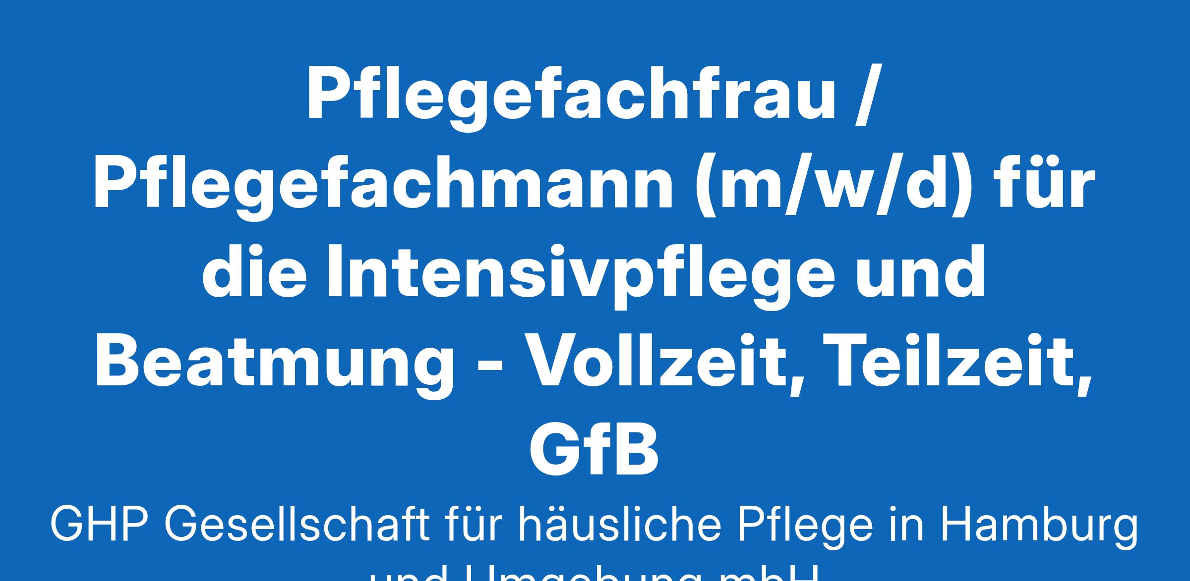Unser Team freut sich über Verstärkung. Wir suchen eine/-nPflegefachfrau / Pflegefachmann(m/w/d) für die Intensivpflege und Beatmung - Vollzeit, Teilzeit, GfBDie „Gesellschaft für häusliche Pflege in Hamburg und Umgebung“ versorgt im Großraum Hamburg mit verschiedenen Pflegeteams ausschließlich intensiv- und beatmungspflichtige Kunden/Innen, die im Rahmen eines betreuten Wohnens einer 24-Stundenbetreuung bedürfen.In deinem Aufgabenbereich zeigst du Herz & VerstandPflegefachliche Kompetenz für eine professionelle Grund-, Behandlungs- oder IntensivpflegeDie Klienten stehen bei dir an erster Stelle: du förderst und forderst die Fähigkeiten der dir anvertrauten MenschenKlar, dass du auch die ärztlichen Diagnosen und Therapien jedes Einzelnen im Blick behältst und begleitestSelbstständige und sorgfältige Dokumentation des PflegeprozessNeben deinem Fachwissen bringst du gute Laune und Empathie mitDeshalb können wir zuversichtlich auf dich setzenDu hast eine Ausbildung zum Altenpfleger/in oder Gesundheits- und Krankenpfleger/in (m/w/d) erfolgreich abgeschlossen und zusätzlich die DIGAB-Zusatzqualifikationen oder einschlägige Erfahrung/Qualifikationen in der Versorgung beatmungs- und intensivpflichtiger Menschen oder aber die Bereitschaft, dich in diesem Bereich weiterzubildenDu hast Empathie, sowie eine positive Einstellung und Freude am Umgang mit intensiv- und beatmungspflichtiger MenschenAls echte Teamplayer-Persönlichkeit liegt Deine wahre Stärke in der Kommunikation, Du gehst offen auf Deine Kollegen zu und zeigst Dich mitfühlend gegenüber unseren Klienten, wie auch deren AngehörigenWas wir Dir als Arbeitgeber bietenEinen unbefristeten Arbeitsvertrag in einem renommierten UnternehmenEine attraktive Vergütung zzgl. Weihnachtsgeld30 Arbeitstage Urlaub in der 5-Tage-WocheArbeit, die zu Deinem Leben passt: Flexible Arbeitszeitmodelle (Voll- oder Teilzeit)Viele Mitarbeitervorteile: Vermögenswirksame Leistungen, Kita-Zuschuss, Jubiläumsbonus, Einspringprämie für zusätzlich geleistete Dienste sowie auch eine Willkommensprämie, MonatsfahrkarteGesundheitsprämie, betriebliche Gesundheitsförderung, frisches Obst, kostenlose GetränkeMitarbeiter werben Mitarbeiter: Prämie bis zu 1.000,– €Betriebstreue wird bei uns belohnt: Deine Vergütung steigt automatisch mit den JahrenStrukturierte Einarbeitung: Vom ersten Tag an steht Dir eine feste Bezugsperson und ein motiviertes Team zur SeiteEntlastung im Arbeitsalltag: Vereinfachte Dokumentation durch optimierte Abläufe und Qualitätsmanagement sowie verlässliche DienstpläneWeiterbildung: Profitiere von unseren kontinuierlichen Fortbildungen innerhalb der ArbeitszeitKarrierechancen: Wir erstellen mit Dir einen Fortbildungsplan für vielfältige Karrierechancen, wie z. B. Fachbereichs- oder Pflegedienstleiter/in, Hygienebeauftragte/r, Praxisanleiter/in oder Wundmanager/in (w/m/d) in unserem HausGelebte Wertschätzung: Wir bieten regelmäßige Mitarbeiterevents und haben immer ein offenes Ohr – Du bist uns wichtig!Familiäre Atmosphäre: In unseren Teams wird Zusammenhalt gelebt, denn: Gemeinsam stark – gemeinsam besser!Kurze Abstimmungswege – eine offene und direkte Kommunikation mit den Vorgesetzten ist jederzeit möglichAbwechslung garantiert: Freu Dich auf erfüllende Aufgaben, wir packen gemeinsam anWähle einen Arbeitgeber, der auch für dich da ist und bewirb dich jetzt gleich!