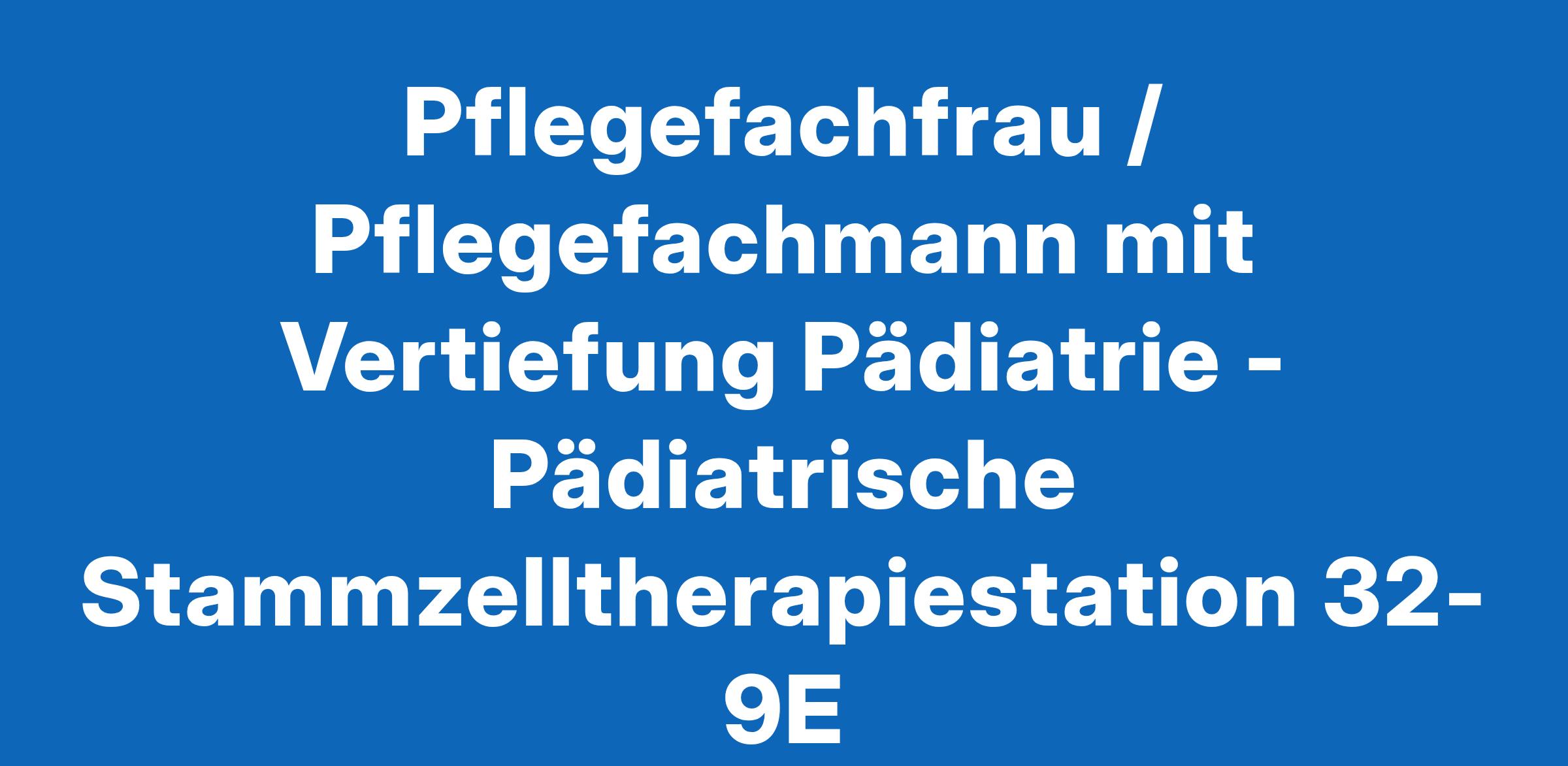 „Aus Wissen wird Gesundheit“ - wir füllen dieses Motto tagtäglich mit Leben, entwickeln neue Ideen und Altbewährtes weiter. Das Universitätsklinikum Frankfurt besteht seit 1914 und unsere rund 8.500 Beschäftigten bringen sich mit ihrem Können und Wissen an den 33 Fachkliniken, klinisch theoretischen Instituten und in den Verwaltungsbereichen ein. Die enge Verbindung von Krankenversorgung mit Forschung und Lehre sowie ein Klima der Kollegialität, Internationalität und berufsgruppenübergreifender Zusammenarbeit zeichnen das Universitätsklinikum aus.Pflegefachfrau / Pflegefachmann mit Vertiefung Pädiatrie - Pädiatrische Stammzelltherapiestation 32-9E(wir richten uns mit dieser Ausschreibung an Bewerbende jeden Geschlechts)