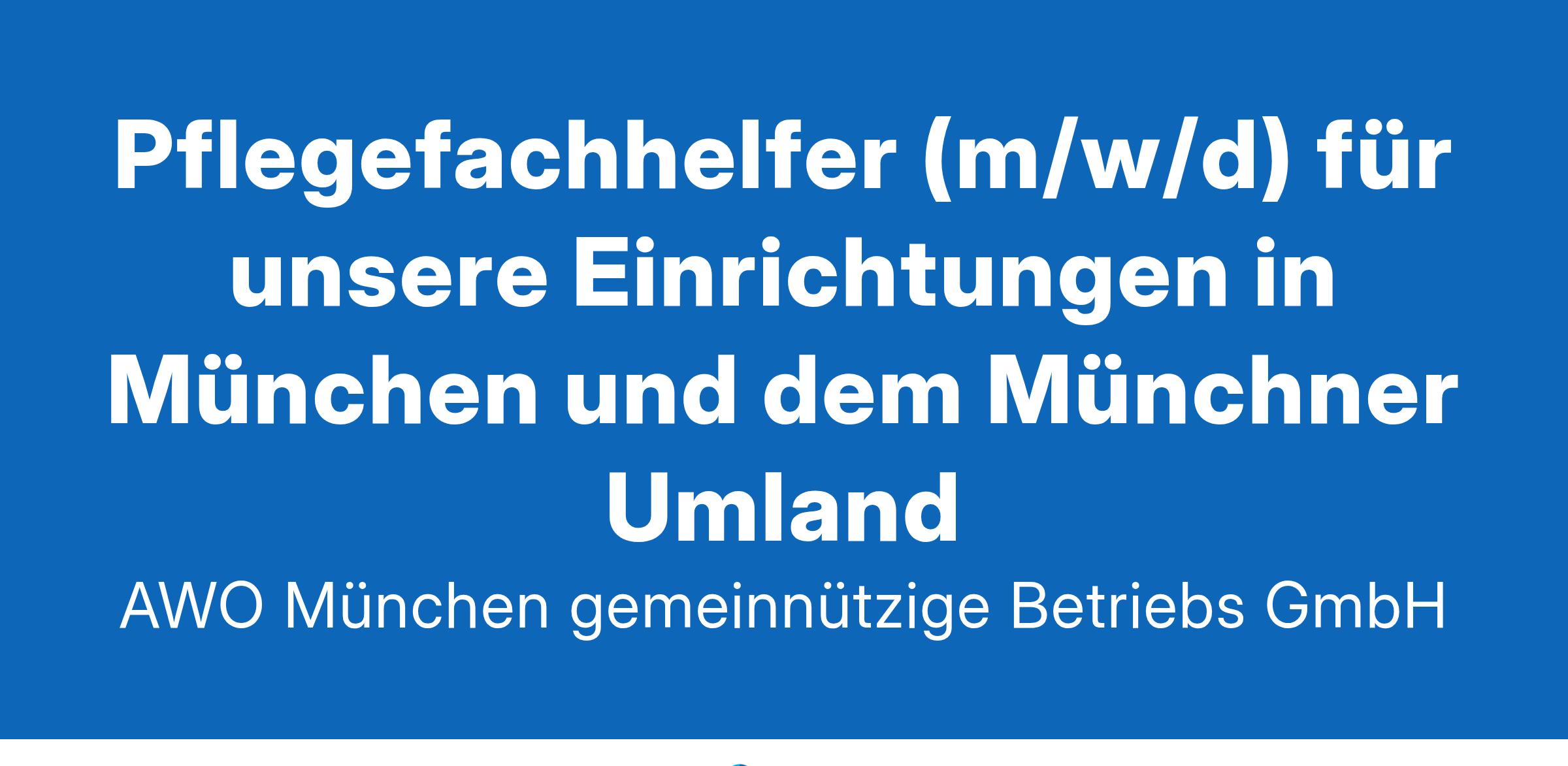 Die AWO München-Stadt ist in vielen Bereichen sozialer Arbeit in München aktiv. In der "Weltstadt mit Herz" trägt sie dazu bei, dass sich Familien, Jugendliche, Senior*innen, Migrant*innen und Menschen mit sozialen, beruflichen oder psychischen Problemen wohl fühlen und einen Platz in der Gesellschaft finden.Wollen Sie an dieser Aufgabe mitarbeiten? Wir suchen Sie alsPflegefachhelfer (m/w/d) für unsere Einrichtungen in München und dem Münchner UmlandStandort: Flexibler Arbeitsort