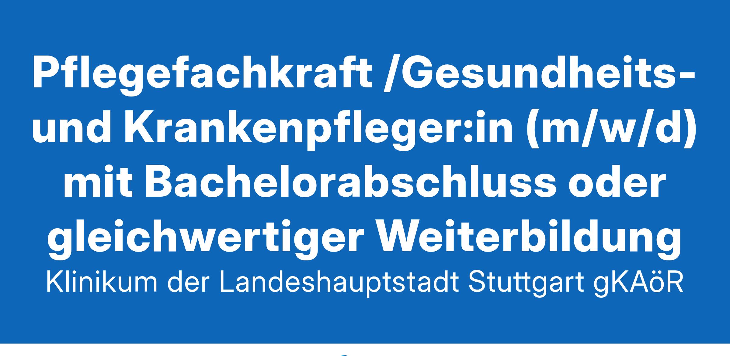 Sie haben sich auf Basis einer Pflegeausbildung pflegefachlich bzw. pflegewissenschaftlich weitergebildet und verfügen durch Ihr Erfahrungswissen in Kombination mit theoretischen Grundlagen über eine mit dem Pflegestudium vergleichbare QualifikationSie haben Organisationskompetenz und VerantwortungsbewusstseinSie besitzen umfassende pflegerische Kompetenzen und haben Freude am BerufEngagement und Teamfähigkeit sind für Sie selbstverständlichWir bieten:Ein verantwortungsvolles und vielseitiges AufgabengebietEine kooperative, vertrauensvolle Zusammenarbeit mit guter Arbeitsatmosphäre und Integration in ein multiprofessionelles und interprofessionelles TeamEin individuelles, strukturiertes und fachspezifisches EinarbeitungskonzeptUnterstützungsangebote zur Vereinbarkeit von Beruf und Familie:Familienfreundliche ArbeitszeitmodelleBetriebliche Kindertageseinrichtung und Möglichkeit der FerienbetreuungIndividuelle Begleitung beim Wiedereinstieg nach ElternzeitBei Tätigkeit im Springerpool: Dienstplan nach WunschGroßes Angebot an innerbetrieblichen Aus-, Fort- und Weiterbildungsmöglichkeiten mit rund 120 Kursplätzen über unsere Akademie für Gesundheitsberufe sowie vielfältige AufstiegsmöglichkeitenRückzahlungsverpflichtungen aus einer Fachweiterbildung können ggf. übernommen werdenWeitere Leistungen: Betriebliches Gesundheitsmanagement, Sportangebote, vergünstigtes Essen im Betriebsrestaurant, kostenloses DeutschlandticketEine leistungsgerechte, tariflich abgesicherte Vergütung nach den Tarifverträgen des öffentlichen Dienstes (TVöD)Eine überwiegend arbeitgeberfinanzierte betriebliche Altersvorsorge (ZVK)Ein unbefristetes ArbeitsverhältnisDie Stadt Stuttgart bietet als Großstadt vielseitige Kultur- und Freizeitangebote. Das Klinikum Stuttgart ist seit 2008 als familienfreundliches Unternehmen durch „berufundfamilie GmbH“ zertifiziert. Für Fragen und Informationen steht Ihnen Herr Hinte, Pflegerische Zentrumsleitung, unter Tel. 0711/278-32054 zur Verfügung.