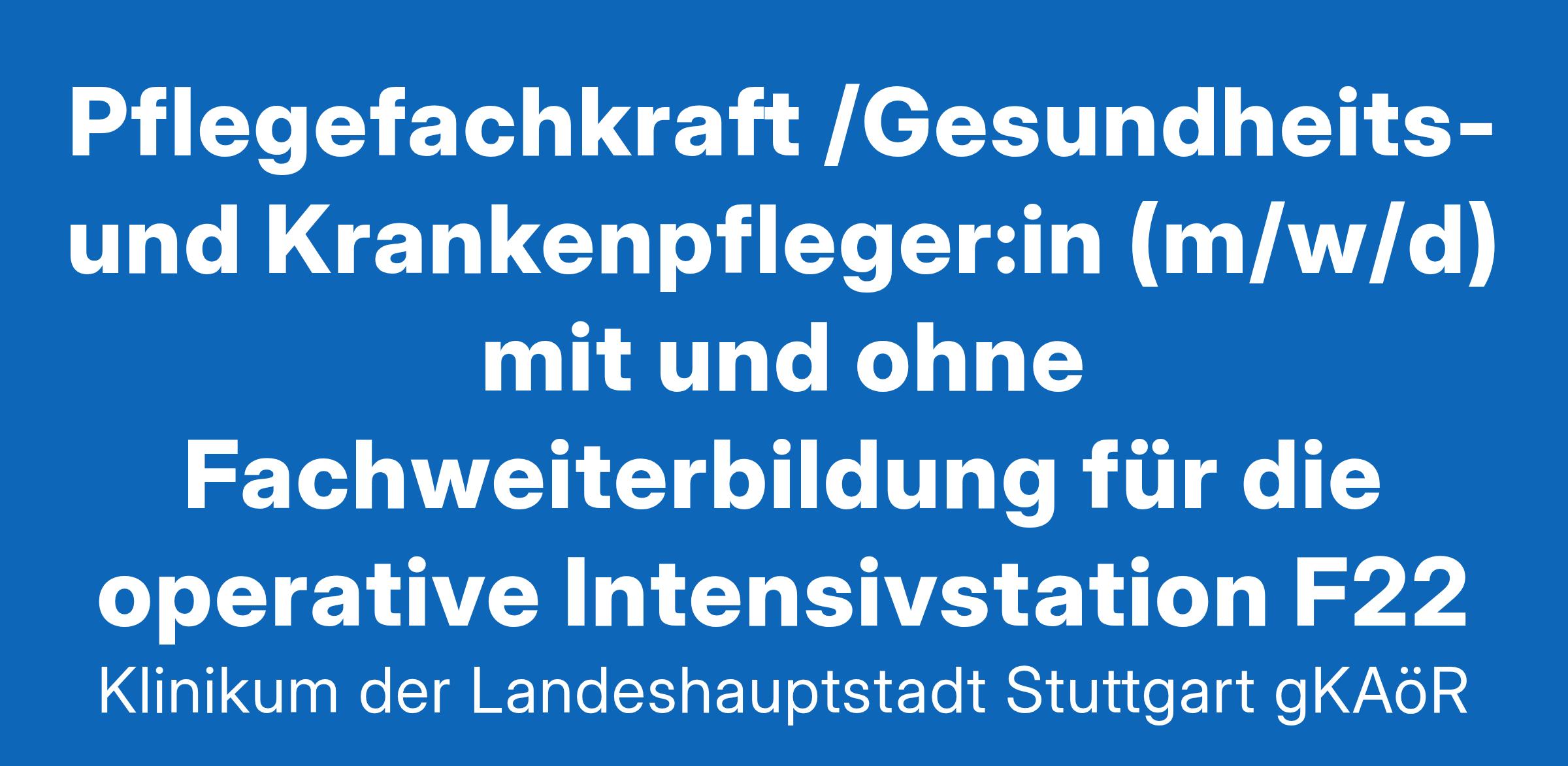 Klinikum Stuttgart - Entscheiden Sie sich für etwas Großes. Wir sind mit unseren drei Häusern „Katharinenhospital“, „Olgahospital“ und „Krankenhaus Bad Cannstatt“ das größte Klinikum in Baden-Württemberg. Über 9000 Mitarbeitende versorgen auf den Stationen, in Operationssälen, Funktionsbereichen die Patient:innen oder sind in Verwaltung, Technik oder IT für den reibungslosen Klinikbetrieb verantwortlich. An zwei attraktiv gelegenen Standorten in Stuttgart bieten wir Ihnen in über 50 Kliniken und Instituten als Maximalversorger und akademisches Lehrkrankenhaus der Universität Tübingen einen sinnstiftenden und zukunftsorientierten Arbeitsplatz. Dabei gilt immer: “Starkes Team. Starkes Klinikum. “Ihre Aufgaben: In unserem Zentrum für operative Medizin am Standort Mitte- Katharinenhospital ist auf der Interdisziplinären operativen Intensivstation F22 eine Teil- / Vollzeit-Stelle zum nächstmöglichen Zeitpunkt zu besetzen. Die Intensivstation ist mit 30 Planbetten ausgewiesen und versorgt schwerpunktmäßig Patienten der Neurochirurgie, der Allgemein- und Viszeralchirurgie, der Unfall- und Gefäßchirurgie , der Orthopädie und der Gynäkologie.