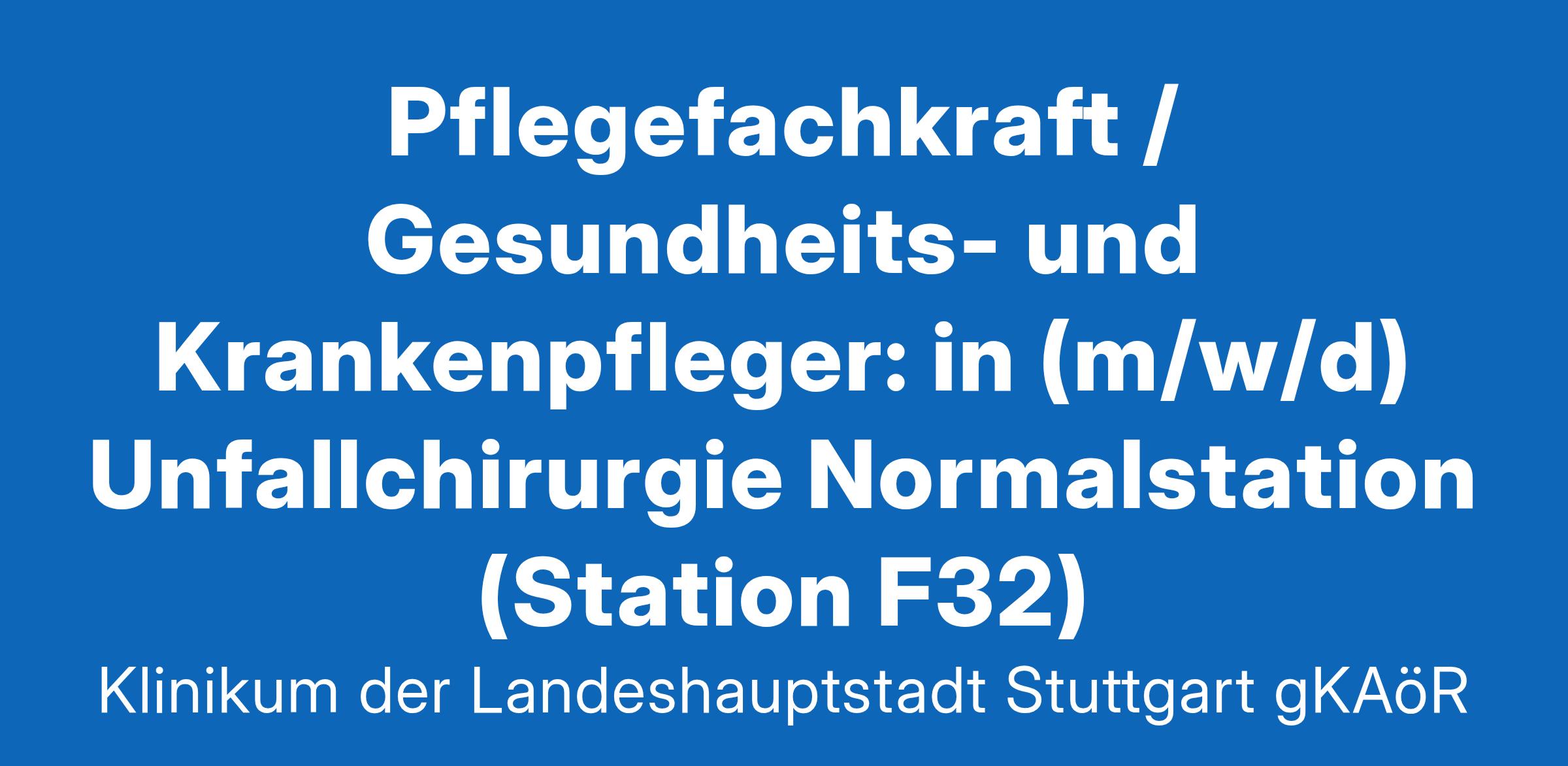 Klinikum Stuttgart - Entscheiden Sie sich für etwas Großes. Wir sind mit unseren drei Häusern „Katharinenhospital“, „Olgahospital“ und „Krankenhaus Bad Cannstatt“ das größte Klinikum in Baden-Württemberg. Über 9000 Mitarbeitende versorgen auf den Stationen, in Operationssälen, Funktionsbereichen die Patient:innen oder sind in Verwaltung, Technik oder IT für den reibungslosen Klinikbetrieb verantwortlich. An zwei attraktiv gelegenen Standorten in Stuttgart bieten wir Ihnen in über 50 Kliniken und Instituten als Maximalversorger und akademisches Lehrkrankenhaus der Universität Tübingen einen sinnstiftenden und zukunftsorientierten Arbeitsplatz. Dabei gilt immer: “Starkes Team. Starkes Klinikum. “Ihre Aufgaben: Für unsere Unfallchirurgische Normalstation (F32) am Standort Mitte – Kriegsbergstraße 60, mit 36 Betten suchen wir eine Pflegefachkraft bzw. eine:n Gesundheits- und Krankenpfleger: in (m/w/d) zur Unterstützung der Pflegefachkräfte bei der Versorgung und Pflege von Patientinnen und Patienten.Unser Pflegekonzept verfolgt die ganzheitliche Bereichspflege und basiert auf dem Pflegemodell nach Roper-Logan-Tierney. Dies wird unterstützt durch die fachspezifische und kinästhetische Kompetenz unserer Mitarbeiter.Ihr Aufgabenfeld in der Unfallchirurgie umfasst:Durchführung und Unterstützung unserer Patient:innen bei diagnostischen und therapeutischen MaßnahmenSicherung der Grund- und Behandlungspflege sowie Durchführung von Pflegeinterventionen auf ärztliche AnordnungBetreuung und Überwachung der Patient:innen vor und nach interventionellen MaßnahmenDurchführung der prä- und postoperativen Pflege und ÜberwachungUmgang mit Infusionen, Infusomaten und PerfusorenKontrolle von Wunden und Durchführung von bedarfsgerechten VerbandwechselnPlanung und Organisation des täglichen ArbeitsablaufesKooperative Zusammenarbeit mit anderen BerufsgruppenDie Einhaltung der Hygiene- und UnfallverhütungsvorschriftenPlanung, Durchführung und Evaluation von Pflegemaßnahmen unter Einbezug von Pflegekonzepten und ExpertenstandardsPsychosoziale Betreuung der Patient:innen und Beratung der AngehörigenWir erwarten:Sie sind examinierte:r Gesundheits- und Krankenpfleger:in oder examinierte:r Altenpfleger:in bzw. examinierte Pflegefachkraft (m/w/d)Sie haben Organisationskompetenz und VerantwortungsbewusstseinSie besitzen umfassende pflegerische und soziale Kompetenzen und haben Freude am BerufEngagement und Teamfähigkeit sind für Sie selbstverständlichWir bieten:Ein verantwortungsvolles und vielseitiges AufgabengebietEine kooperative, vertrauensvolle Zusammenarbeit mit guter Arbeitsatmosphäre und Integration in ein multiprofessionelles und interprofessionelles TeamEin individuelles, strukturiertes und fachspezifisches EinarbeitungskonzeptUnterstützungsangebote zur Vereinbarkeit von Beruf und Familie:Familienfreundliche ArbeitszeitmodelleBetriebliche Kindertageseinrichtung und Möglichkeit der FerienbetreuungIndividuelle Begleitung bei der WiedereingliederungBei Tätigkeit im Springerpool: Dienstplan nach Wunsch und Möglichkeiten etc.Großes Angebot an innerbetrieblichen Aus-, Fort- und Weiterbildungsmöglichkeiten mit rund 120 Kursplätzen über unsere Akademie für Gesundheitsberufe sowie vielfältige AufstiegsmöglichkeitenRückzahlungsverpflichtungen aus einer Fachweiterbildung können ggf. übernommen werdenWeitere Leistungen: Betriebliches Gesundheitsmanagement, Sportangebote, vergünstigtes Essen im Betriebsrestaurant, kostenloses DeutschlandticketEine leistungsgerechte, tariflich abgesicherte Vergütung nach den Tarifverträgen des öffentlichen Dienstes (TVöD)Eine überwiegend arbeitgeberfinanzierte betriebliche Altersvorsorge (ZVK)Ein unbefristetes ArbeitsverhältnisDie Stadt Stuttgart bietet als Großstadt vielseitige Kultur- und Freizeitangebote. Das Klinikum Stuttgart ist seit 2008 als familienfreundliches Unternehmen durch „Beruf und Familie GmbH“ zertifiziert. Für Fragen und Informationen steht Ihnen Herr Hinte, Pflegerische Zentrumsleitung, unter 0711/278 - 32049 zur Verfügung.