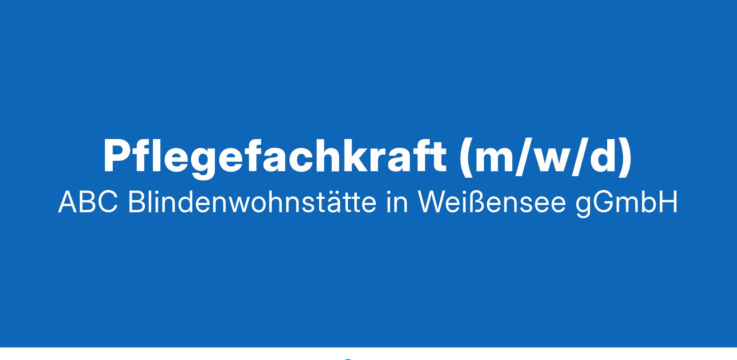 Pflegefachkraft (m/w/d) In unseren gemeinnützigen Einrichtungen pflegen und betreuen wir über 200 blinde und sehbehinderte Menschen. Aufgrund unserer Bewohnerschaft mit ihrer Beeinträchtigung beim Sehen können wir mehr Pflege und Betreuungspersonal einsetzen. Für die spezielle Pflege und Betreuung werden Sie geschult. Qualität ist uns wichtig. Wir suchen ab sofort (m/w/d) für unsere Einrichtung in Weißensee qualifizierte Pflegefachkräfte in Voll- und Teilzeit oder geringfügig Ihre Perspektiven unbefristete Festanstellung Fortbildungen verschiedene Zusatzleistungen übertarfliche Bezahlung Interessiert? Dann freuen wir uns auf Ihre Bewerbung mit Lebenslauf und Zeugnissen. Vorabinformationen geben Ihnen gern unsere Heimleiter. Senden Sie Ihre Unterlagen bitte per Post oder E-Mail an ABC Blindenwohnstätte Berlin-Weißensee Geschäftsführung Herrn Menzel Berliner Allee 193-197, 13088 Berlin joerg.menzel@blindenwohnstaetten.de Telefon: 030 / 3350 0669 Mitglied in: