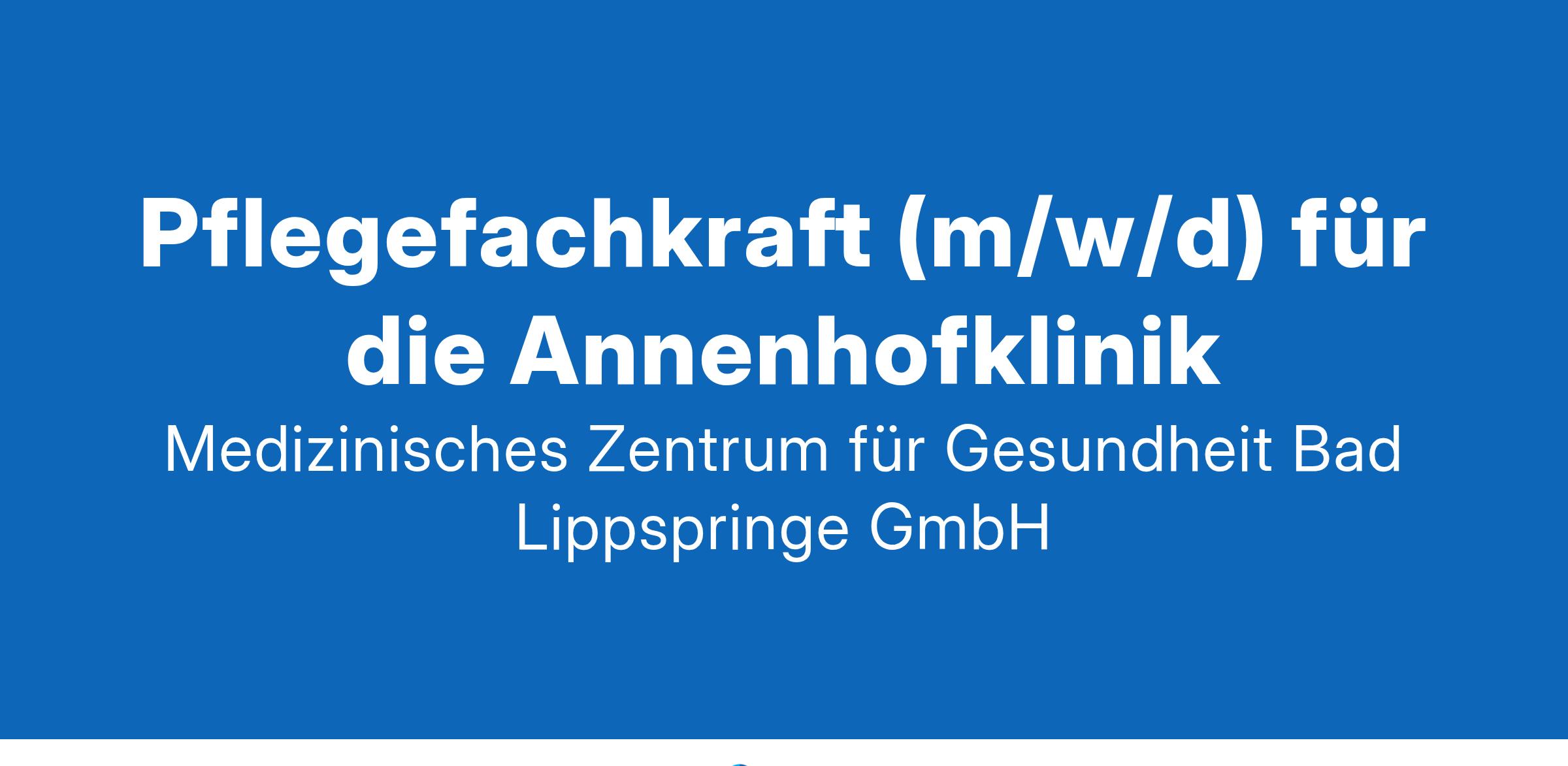 Pflegefachkraft (m/w/d) für die AnnenhofklinikAls Teil des Medizinischen Zentrums für Gesundheit in Bad Lippspringe verfügt unsere Annenhofklinik am Standort Steinheim über 50 Therapieplätze zur Rehabilitation von drogenabhängigen Frauen und Männern. Die Größe der Einrichtung ermöglicht damit eine individuelle und familiäre Betreuung. Eine wesentliche Säule in der Behandlung sind abgestimmte Therapien in einer naturnahen Umgebung, inklusive der Pflege der hofeigenen Tiere. Damit bietet der Annenhof ein therapeutisches Angebot, welches im gesamten Bundesgebiet selten zu finden ist.Im Laufe des Jahres zieht die Einrichtung in ihre neue Heimat, die Schanzenbergklinik in Horn-Bad Meinberg, um.