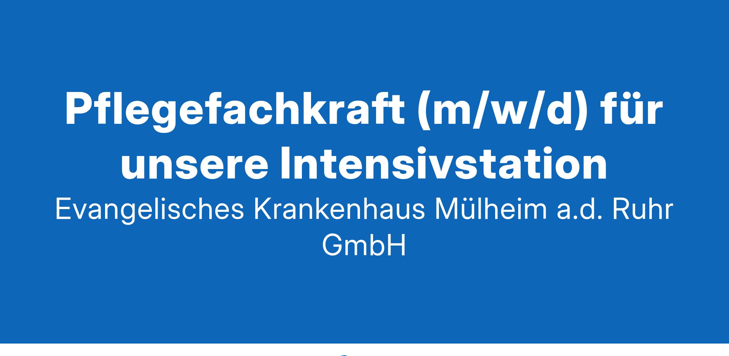 Karriere im Evangelischen Krankenhaus MülheimWir bieten unseren Mitarbeitenden ein professionelles und modernes Arbeitsumfeld. Ein angenehmes Arbeitsklima sowie ein guter Teamgeist sind für uns selbstverständlich. Die Kompetenz und die Motivation unserer Mitarbeitenden sind uns sehr wichtig: Daher unterstützen wir unsere Mitarbeitenden mit hochprofessionellen Fort- und Weiterbildungen in ihrer beruflichen und persönlichen Weiterentwicklung. In unseren Kliniken fühlen wir uns dem Menschen verpflichtet, unabhängig davon, ob es sich um Mitarbeitende, Patientinnen und Patienten oder um Angehörige handelt. Unser Miteinander gestalten wir auf Basis unserer gemeinsamen Werte. Das heißt unter anderem, dass wir jedem Menschen mit Respekt begegnen, in den offenen Austausch gehen und verlässlich in unseren Entscheidungen sind. Wir übernehmen Verantwortung gegenüber Anderen und gestalten gemeinsam nachhaltig unsere Zukunft. Zur Verstärkung und Unterstützung unseres Pflegeteams auf der Intensivstation suchen wir zum nächstmöglichen Zeitpunkt eine Pflegefachkraft (m/w/d)
