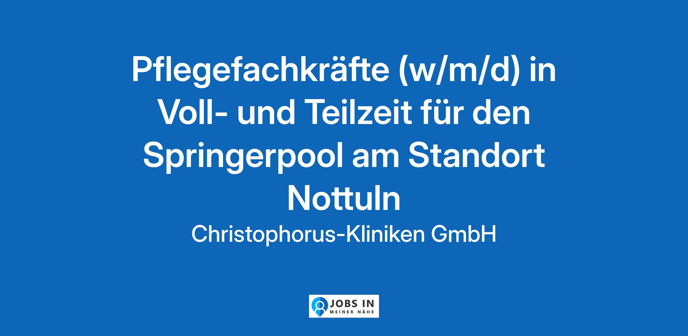 Die Christophorus Kliniken GmbH sind ein modernes und leistungsfähiges Schwerpunktkrankenhaus im Münsterland an den Standorten Coesfeld, Dülmen und Nottuln mit insgesamt 620 Planbetten. In 15 Fachabteilungen versorgen unsere rund 2.300 hoch engagierten Mitarbeiterinnen und Mitarbeiter jährlich etwa 60.000 Patienten stationär und ambulant. Zur übergeordneten Christophorus Trägergesellschaft mit rund 3.400 Mitarbeitenden gehören weiterhin eine Klinik für Psychiatrie und Psychotherapie, drei Altenpflegeeinrichtungen sowie ein ambulanter Pflegedienst. Die Christophorus Kliniken sind akademisches Lehrkrankenhaus der Universität Münster. Werde Teil unseres Teams! Komm und unterstütze uns, so wie du kannst und bereichere unseren Springerpool am Standort Nottuln. Wiedereinstieg? Kein Problem! Keine Angst - durch unsere individuelle Einarbeitung kommst du sicher wieder an Bord. Du bist zusätzlich geplant und unterstützt die Kollegen bei der Versorgung unserer Patienten. Nach Absprache sehr gern individuelle Arbeitszeiten: z.B. kurze Frühdienste von 08..00 Uhr oder z.B. kurze Spätdienste von 17.00 bis 21.00 Uhr.