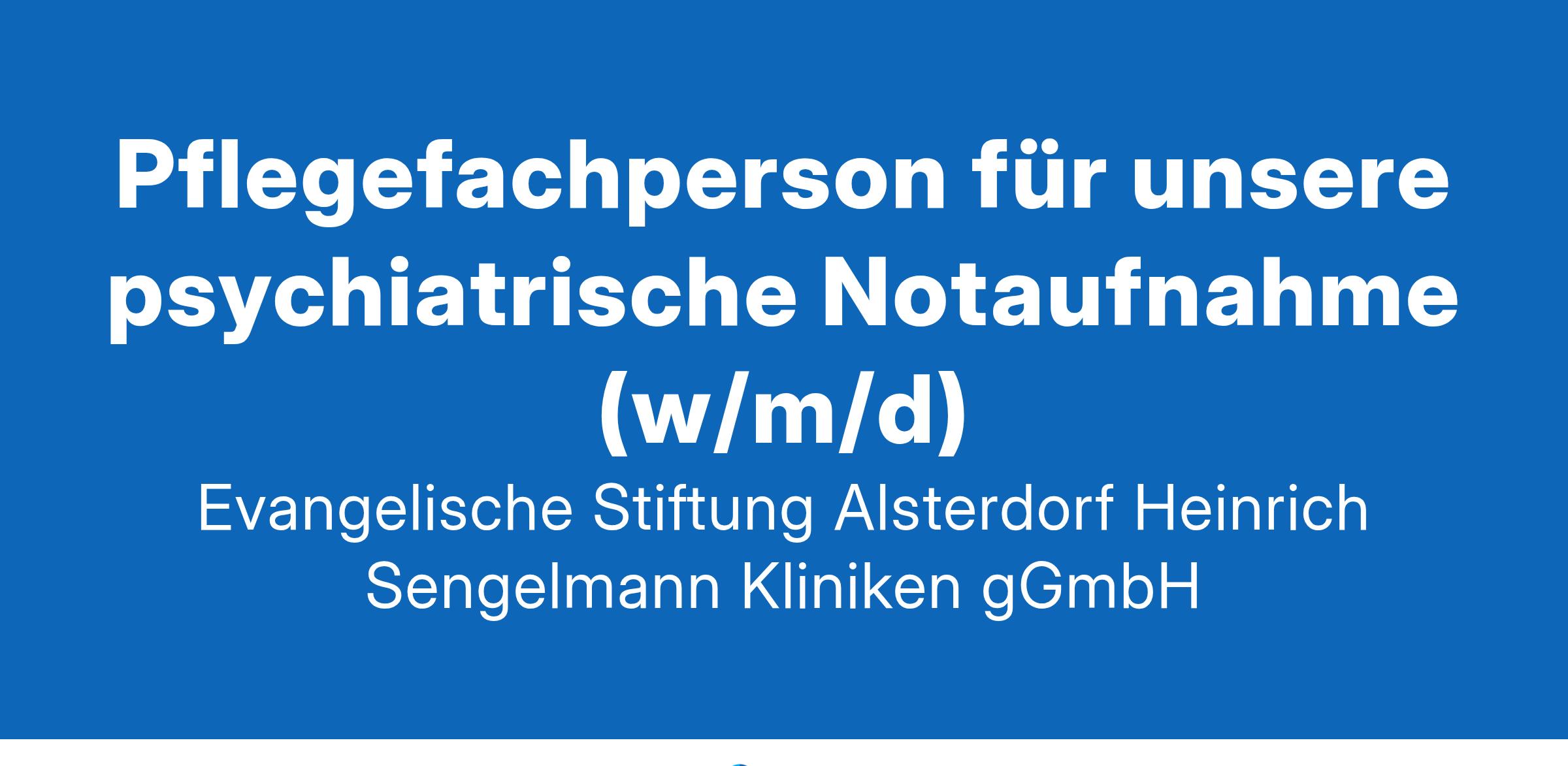 „Hohe Arbeitszufriedenheit und eine gute Atmosphäre: Das ist uns wichtig.“Die Heinrich Sengelmann Kliniken für Psychiatrie, Psychotherapie und Psychosomatik bieten stationäre, tagesklinische und ambulante Behandlungen für Patient*innen der Hansestadt Hamburg, Schleswig Holstein sowie überregional. INDIVIDUELL – AUTHENTISCH – PERSÖNLICH – DAS SIND WIR! Die Heinrich Sengelmann Kliniken gehören im norddeutschen Raum zu den führenden Kliniken in den Bereichen Psychiatrie, Psychotherapie und Psychosomatik. Auch überregional sind wir für unsere Erfahrung und Kompetenz bei der Behandlung seelischer Störungen bekannt. Menschen sind unser Leben! Wenn das bei Dir genauso ist, freuen wir uns auf deine Bewerbung! Pflegefachperson für unsere psychiatrische Notaufnahme (w/m/d) Arbeitsumfeld Auf unserer Station L, der psychiatrischen Notaufnahme, sind wir erste Anlaufstelle für akut psychisch erkrankte Menschen. Ganzheitliche Pflege und Zeit für Gespräche sind prägende Merkmale unserer Zusammenarbeit. Du hast (bisher) keine Erfahrungen in der psychiatrischen Pflege? Kein Problem! Mit unserem umfangreichen Einarbeitungskonzept ist eine optimale fachliche Einarbeitung für dich gesichert. Wir bieten