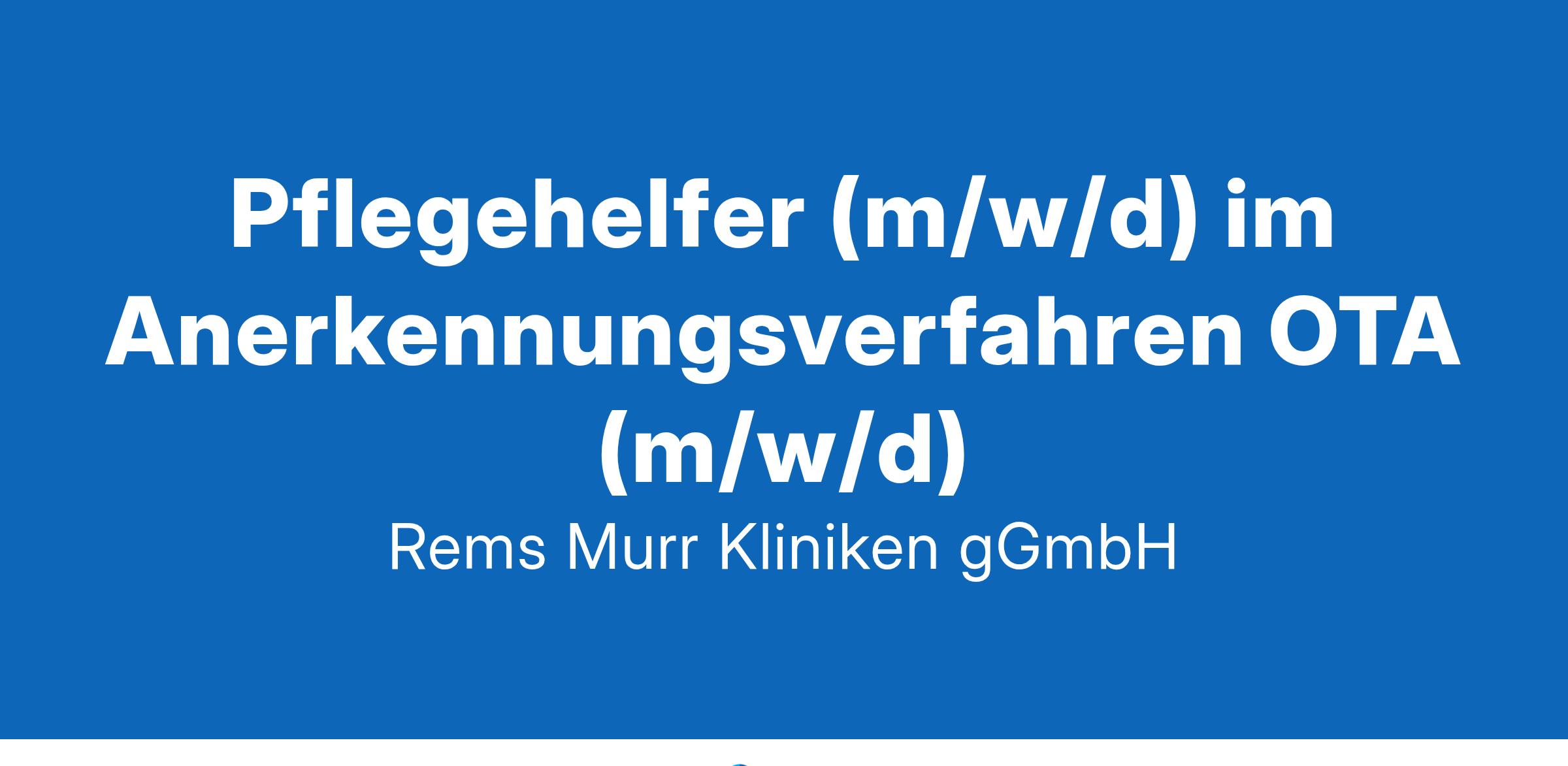 Wir erstatten Stellenanzeige...!Wir suchen zum nächstmöglichen Zeitpunkt in Vollzeit für unsere Klinik Schorndorf einenPflegehelfer (m/w/d) im Anerkennungsverfahren OTA (m/w/d)Referenznummer: S-1-289-24Die Stelle ist zunächst befristet für ein Jahr zu besetzen. Nach erfolgreichem Erhalt der Berufsurkunde wird das Arbeitsverhältnis unbefristet weitergeführt.