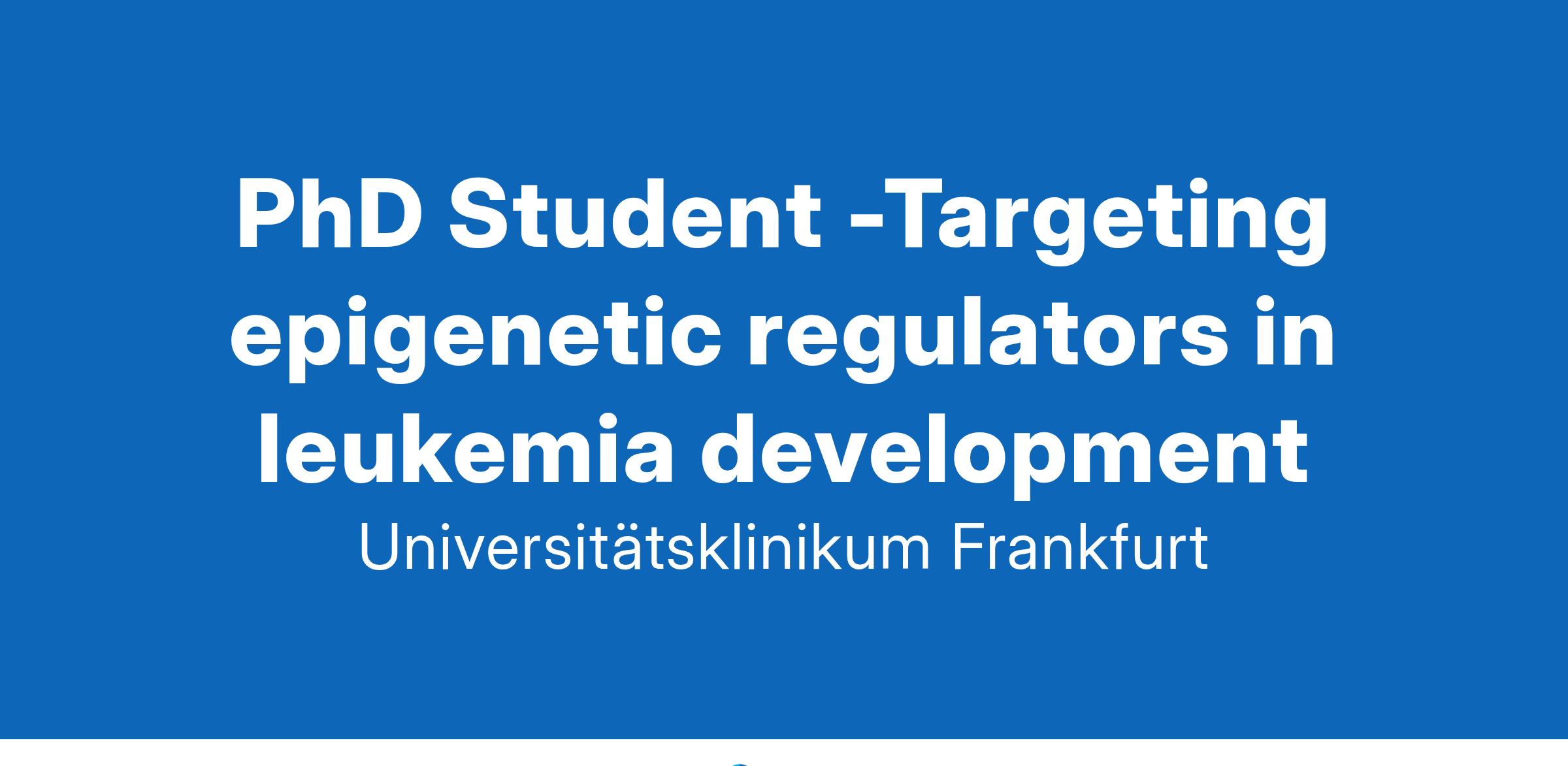 "Knowledge becomes health" - we are filling this motto with life every day, developing new ideas and improv-ing old-established knowledge. The University Hospital Frankfurt has existed since 1914. Our around 8,500 employees contribute with their skills and knowledge to the 33 specialist clinics, theoretical clinical institutes, and administrative departments. The close connection of health care with research and teaching, as well as a climate of collegiality, internationality, and cross-professional cooperation characterize the university hospital.PhD Student -Targeting epigenetic regulators in leukemia development(We are targeting applicants of all genders)