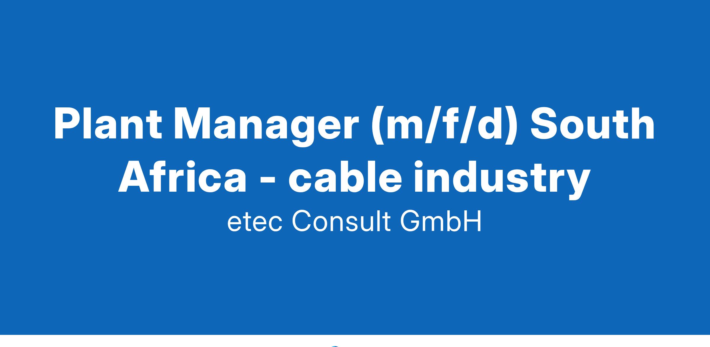 Our client is a medium-sized, highly successful market leader in the cable industry with a turnover in the three-digit million-euro range. The company is characterized by a high level of vertical integration and has production sites on several continents. For the further development of the production site in South Africa, we are looking for you as