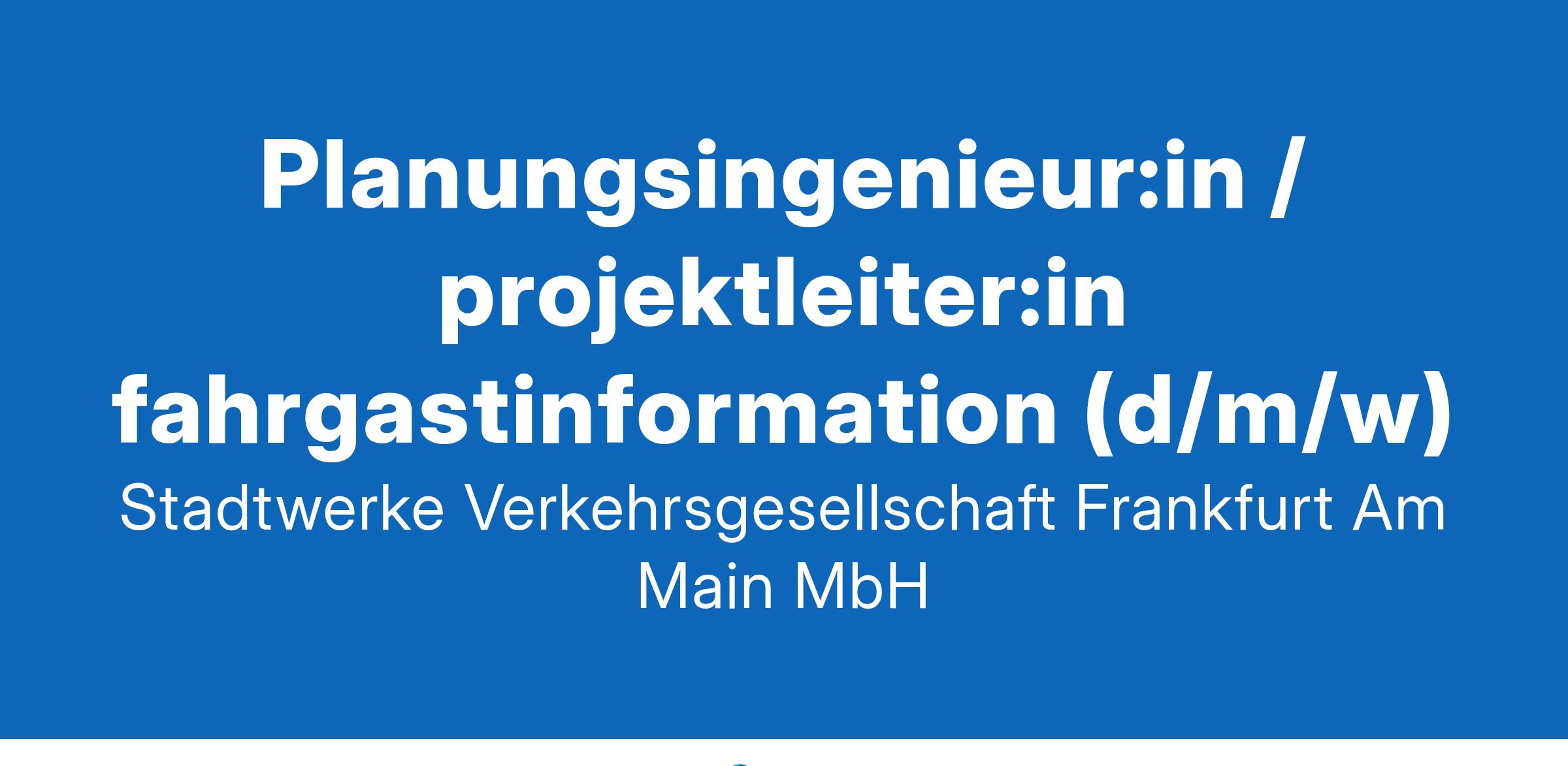 Planungsingenieur:in / Projektleiter:in Fahrgastinformation (d/m/w)Planungsingenieur:in / Projektleiter:in Fahrgastinformation (d/m/w)WIR BEWEGEN MENSCHENAls Verkehrsdienstleisterin arbeiten wir an der Zukunft Frankfurts – als Arbeitgeberin kümmern wir uns mit Ihnen um Ihre Zukunft. Darum leben wir in unserem Unternehmen Offenheit, Toleranz und Gleichberechtigung und unterstützen Sie mit vielfältigen Benefits. Wir glauben: Der Nahverkehr ist die Zukunft der Mobilität. Deswegen entwickeln wir mit Leidenschaft neue Ideen und Konzepte.Arbeiten Sie mit uns an der Mobilität Frankfurts!IHRE AUFGABENSie sind für die Projektplanung und das Projektmanagement im Bereich von Umbau/Ausstattung von Haltestellen mit Nachrichtentechnik für die Fahrgastinformation verantwortlichSie betreuen das Projekt von der Budgetplanung bis zur AbnahmeSie arbeiten Fachplanungen im Bereich der Fahrgastinformationssysteme sowie der nachrichtentechnischen Ausstattung von Haltestellen und Stationen ausDie Erstellung von Wirtschaftsplänen, Anforderungen und Ausschreibungsunterlagen liegt ebenfalls bei IhnenSie koordinieren externe Firmen und führen Abnahme- und Zulassungsprozesse durchIn diesem Zusammenhang gehört die Einholung von Genehmigungen bei Ämtern und Behörden zu Ihren AufgabenSie entwickeln Ideen und Innovationen zur Modernisierung und Digitalisierung unserer Systeme