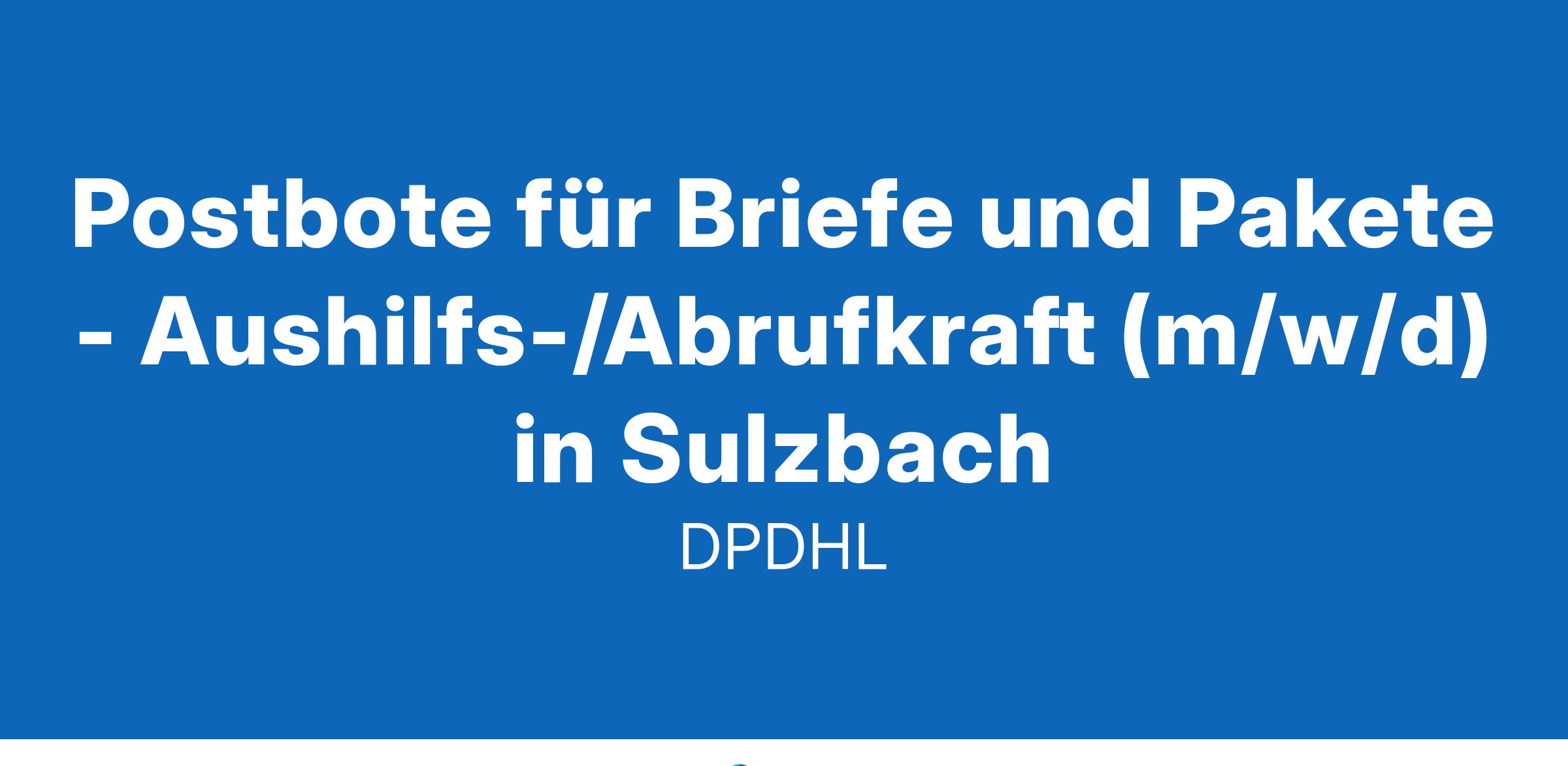Werde Aushilfe / Minijobber als Postbote für Pakete und Briefe in SulzbachAls Aushilfe / Minijobber bist du an einzelnen Tagen oder auch stundenweise für uns tätig. Nach einer bezahlten Einarbeitung kannst du sofort in deinem neuen Nebenjob starten.Was wir bieten16,92 € Tarif-Stundenlohn + ggf. regionale ArbeitsmarktzulageDu kannst sofort starten – Aushilfe / Minijob / StudentenjobFlexible Arbeitszeiten an vereinbarten ArbeitstagenKostenlose Bereitstellung von hochwertiger ArbeitskleidungAusführliche Einweisung (bezahlt) – wir machen dich fit für unser TeamEin krisensicherer Arbeitsplatz, garantierte Gehaltssteigerung gemäß Tarifvertrag und pünktliche GehaltszahlungenDeine Aufgaben bei unsZustellung von Brief- und Paketsendungen mit zur Verfügung gestellten HilfsmittelnSortierung von Paketen auf ZustellgebieteAuslieferung an bestimmten Tagen (zwischen Montag und Samstag)Sendungen im Durchschnitt unter 10 kgZustellung mit unseren Geschäftsfahrzeugen, bspw. vollelektrische FahrzeugeWas du als Aushilfe / Minijobber bietestDu darfst einen Pkw fahren (für die Zustellung)Du kannst dich auf Deutsch unterhaltenDu bist wetterfest und kannst gut anpackenDu bist zuverlässig und hängst dich reinAushilfe / Minijob bei Deutsche Post DHLAls Postbote bringst du den Menschen in deinem Bezirk Post- und Paketsendungen. Dabei lässt du dir von keinem Wetter die Laune verderben. Auch Quereinsteiger oder Studenten sind bei uns herzlich willkommen, denn du zählst, wie du bist!Wir freuen uns auf deine Bewerbung, am besten online! Klicke dazu einfach auf den 'Bewerben'-Button – auch ganz ohne Lebenslauf.MENSCHEN VERBINDEN, LEBEN VERBESSERN#werdeeinervonuns