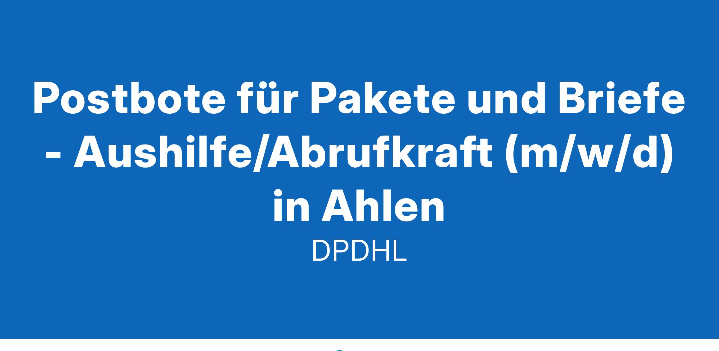 Werde Aushilfe als Postbote für Pakete und Briefe in AhlenAls Aushilfe bist du an einzelnen Tagen oder auch stundenweise für uns tätig. Nach einer bezahlten Einarbeitung kannst du sofort in deinem neuen Nebenjob starten.Was wir bieten16,37 € Tarif-Stundenlohn Du kannst sofort starten – Aushilfe / StudentenjobFlexible Arbeitszeiten an vereinbarten ArbeitstagenKostenlose Bereitstellung von hochwertiger ArbeitskleidungAusführliche Einweisung (bezahlt) – wir machen dich fit für die ZustellungEin krisensicherer Arbeitsplatz, garantierte Gehaltssteigerung gemäß Tarifvertrag und pünktliche GehaltszahlungenDeine Aufgaben als Zusteller bei unsZustellung von Brief- und Paketsendungen mit zur Verfügung gestellten HilfsmittelnAuslieferung an bestimmten Tagen (zwischen Montag und Samstag)Sendungen im Durchschnitt unter 10 kgZustellung mit unseren Geschäftsfahrzeugen, bspw. vollelektrische FahrzeugeWas du als Aushilfe bietestDu darfst einen Pkw fahrenDu kannst dich auf Deutsch unterhaltenDu bist wetterfest und kannst gut anpackenDu bist zuverlässig und hängst dich reinBereitschaft mehr als 538 € im Monat verdienen zu wollen (kein 538 €-Job)Aushilfe bei Deutsche Post DHLAls Postbote bringst du den Menschen in deinem Bezirk Post- und Paketsendungen. Dabei lässt du dir von keinem Wetter die Laune verderben. Auch Quereinsteiger oder Studenten sind bei uns herzlich willkommen, denn du zählst, wie du bist!Wir freuen uns auf deine Bewerbung als Fahrer, am besten online! Klicke dazu einfach auf den 'Bewerben'-Button – auch ganz ohne Lebenslauf.MENSCHEN VERBINDEN, LEBEN VERBESSERN#werdeeinervonuns
