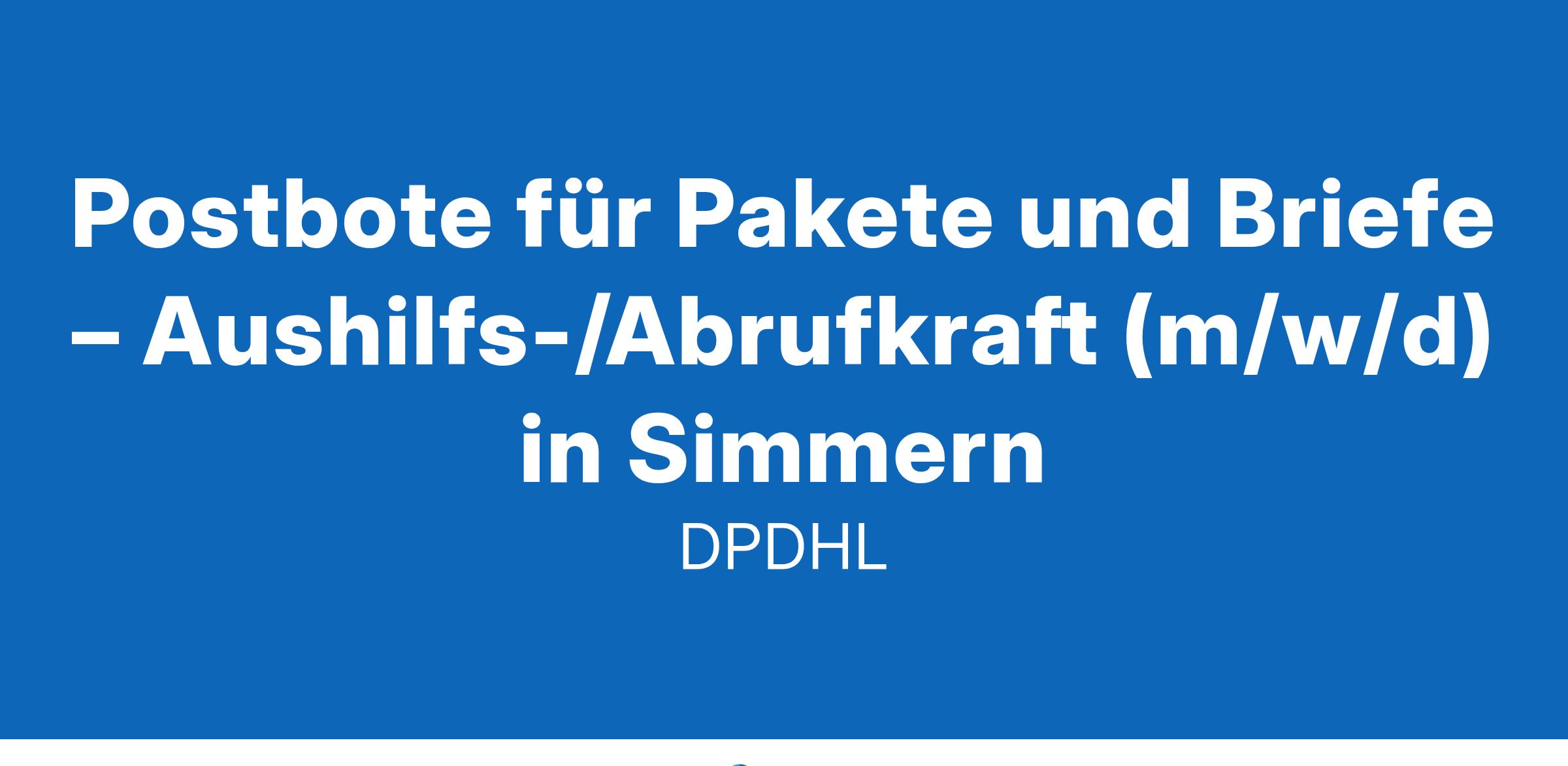 Werde Aushilfe / Minijobber als Postbote für Pakete und Briefe in SimmernAls Aushilfe / Minijobber bist du an einzelnen Tagen oder auch stundenweise für uns tätig. Nach einer bezahlten Einarbeitung kannst du sofort in deinem neuen Nebenjob starten.Was wir bieten16,92 € Tarif-Stundenlohn + ggf. regionale ArbeitsmarktzulageDu kannst sofort starten – Aushilfe / Minijob / StudentenjobFlexible Arbeitszeiten an vereinbarten ArbeitstagenKostenlose Bereitstellung von hochwertiger ArbeitskleidungAusführliche Einweisung (bezahlt) – wir machen dich fit für unser TeamEin krisensicherer Arbeitsplatz, garantierte Gehaltssteigerung gemäß Tarifvertrag und pünktliche GehaltszahlungenDeine Aufgaben bei unsZustellung von Brief- und Paketsendungen mit zur Verfügung gestellten HilfsmittelnSortierung von Paketen auf ZustellgebieteAuslieferung an bestimmten Tagen (zwischen Montag und Samstag)Sendungen im Durchschnitt unter 10 kgZustellung mit unseren Geschäftsfahrzeugen, bspw. vollelektrische FahrzeugeWas du als Aushilfe / Minijobber bietestDu darfst einen Pkw fahren (für die Zustellung)Du kannst dich auf Deutsch unterhaltenDu bist wetterfest und kannst gut anpackenDu bist zuverlässig und hängst dich reinAushilfe / Minijob bei Deutsche Post DHLAls Postbote bringst du den Menschen in deinem Bezirk Post- und Paketsendungen. Dabei lässt du dir von keinem Wetter die Laune verderben. Auch Quereinsteiger oder Studenten sind bei uns herzlich willkommen, denn du zählst, wie du bist!Wir freuen uns auf deine Bewerbung, am besten online! Klicke dazu einfach auf den 'Bewerben'-Button – auch ganz ohne Lebenslauf.MENSCHEN VERBINDEN, LEBEN VERBESSERN#werdeeinervonuns